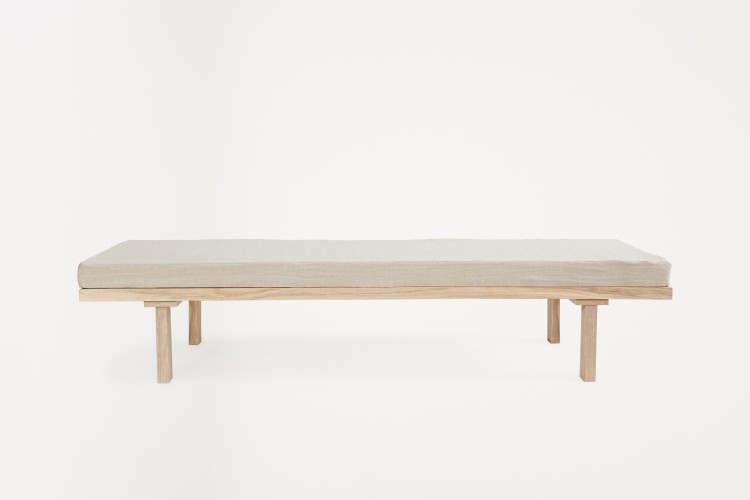 KR-180 Daybed by Kim Richardt is a piece of furniture that uses the simple contrasts of vertical and horizontal lines to create a structurally pure form. A soft natural canvas is fitted around a dense foam mattress, creating the appearance of a pure rectangle atop a solid white oiled oak frame with a monumental structure, almost a silhouette of a bridge.