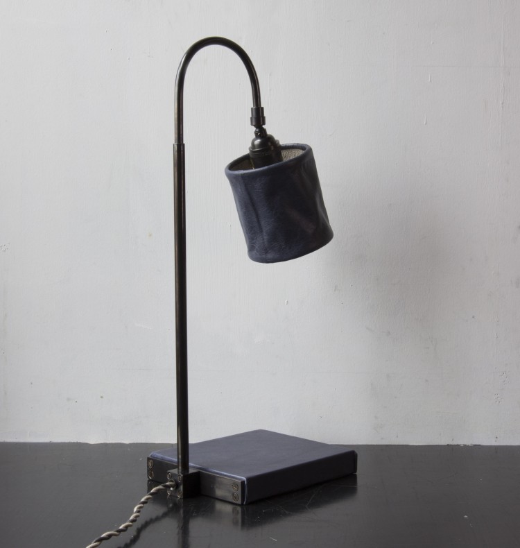 Solid machined polished unlacquered brass, hand-dyed waxed leather, hand-dyed braided cotton cord, pivoting leather shade.