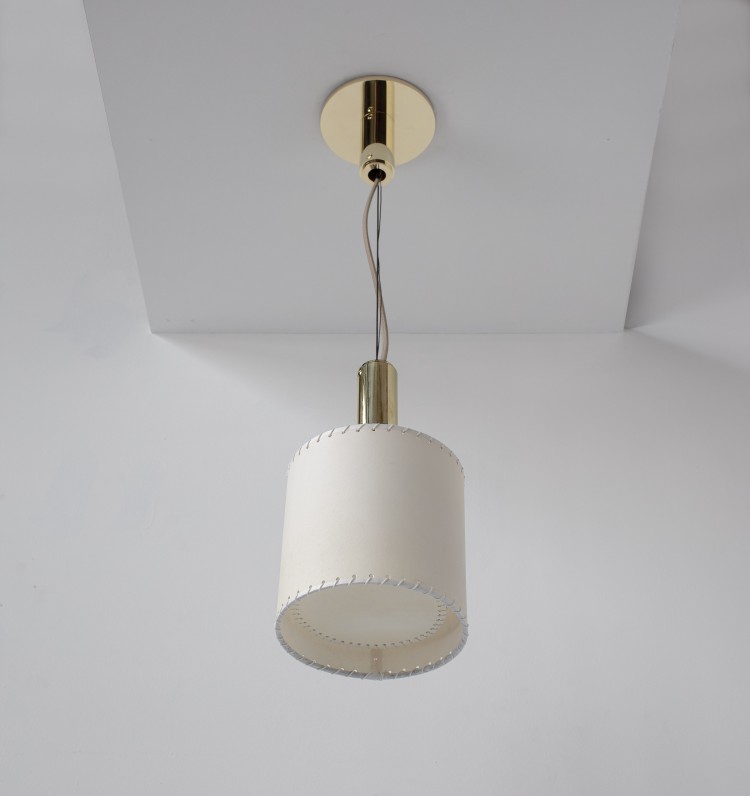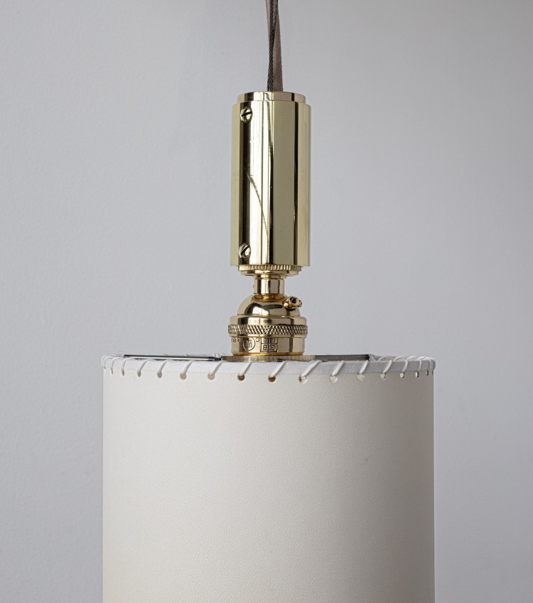 Solid machined brass, hand-stitched accordian folded goatskin parchment shade with diffuser. Goatskin parchment is an excellent diffuser of light and is naturally figured and textured, similar to the surface of the moon.