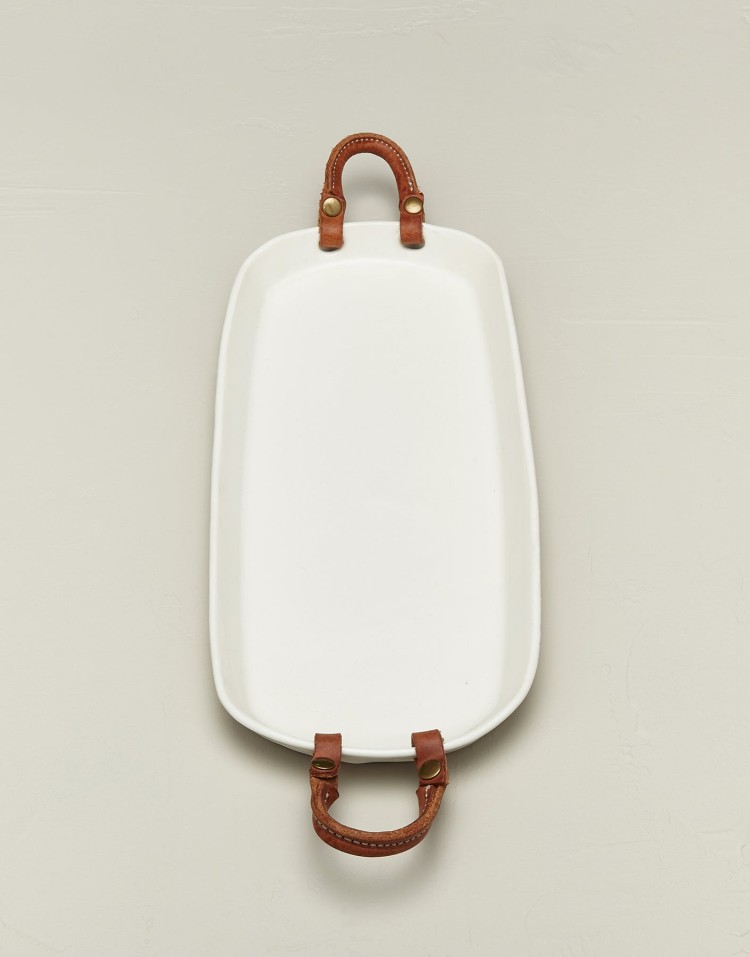 Our newly redesigned tray now features our lovely stitched leather handles with snaps so you can take them off for cleaning the tray then snap them right back on. The perfect long tray for all of your entertaining needs, sleek and beautiful. Add the Remo Pitcher and Battuto Cups for a simple, sophisticated presentation. We can't wait for our next dinner party!