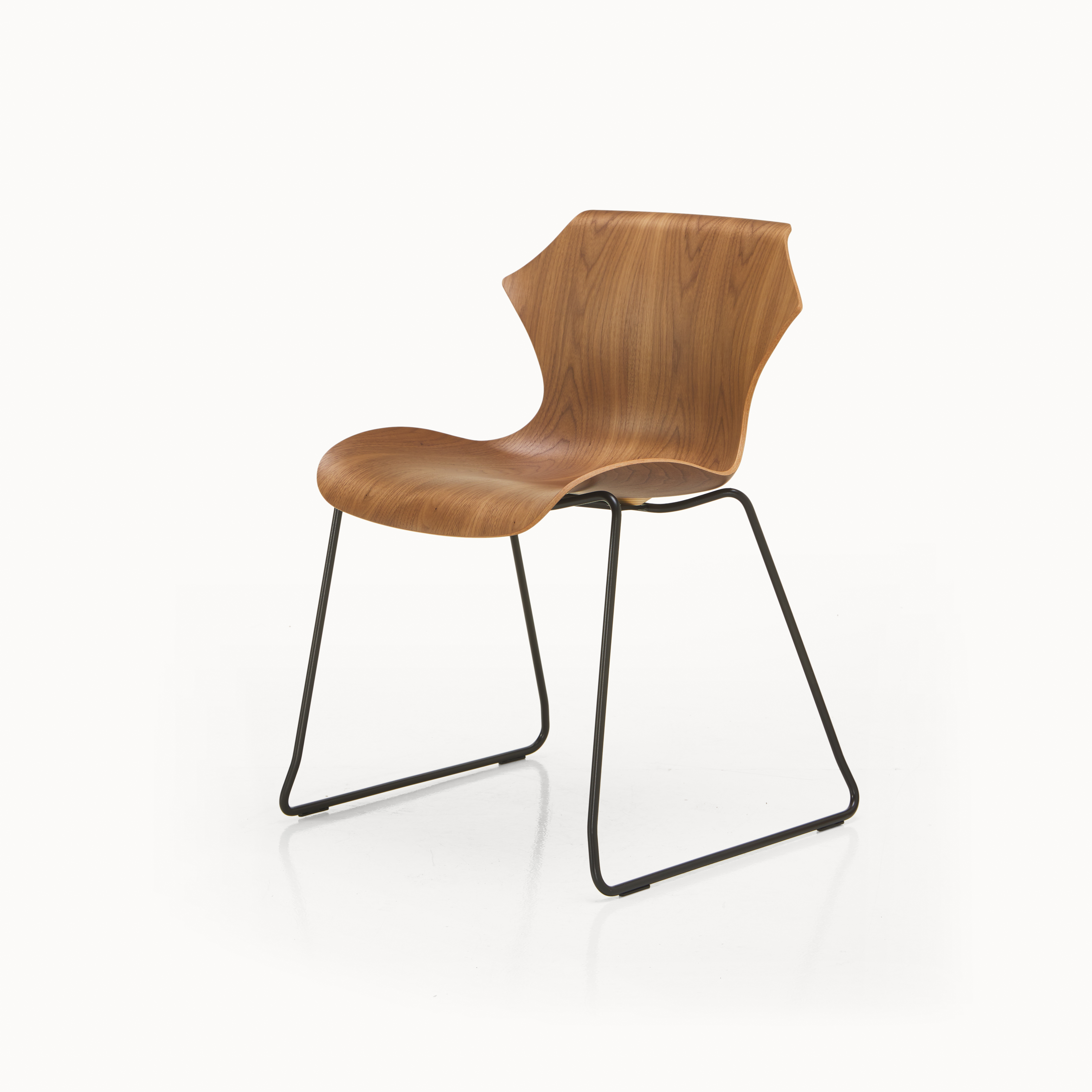 Once again taking the natural world as source inspiration, our Petal Chair, Lounge, and Stool Collection represents the most advanced 3D molded wooden veneer furniture manufactured by anyone to date. Working with the same company that has been pressing the Eames’ molded plywood chairs for decades, we wanted to create a series of pieces in wood, shaped for comfort. Each has a unique curvature in the rump of the shell, waterfall edges, and petal-shaped arms, all with accentuated wood grain that speaks to the organic pattern of lines emanating from the central point of a flower. The Petal Chair Sled Base can be stacked up to 12 high with or without the optional trolley.