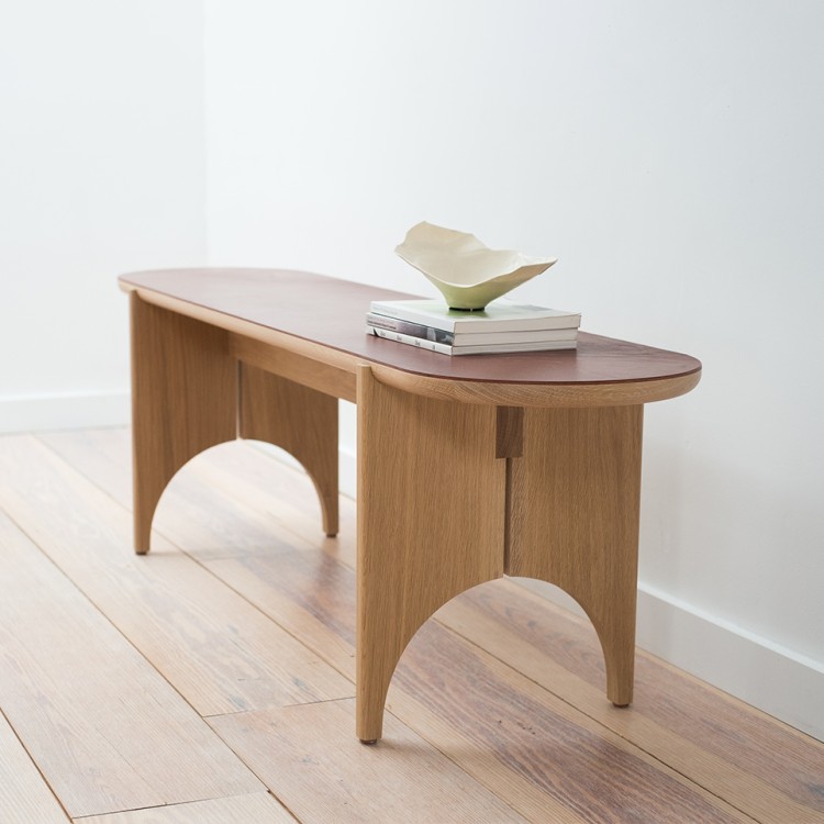 With its distinct reference to shaker design, the Autumn Bench blends traditional concepts with a contemporary form. The crescent shaped legs support a top of solid wood or leather.
