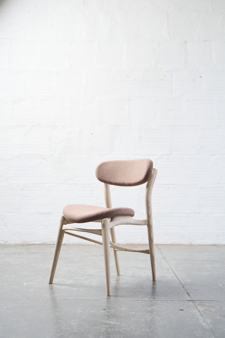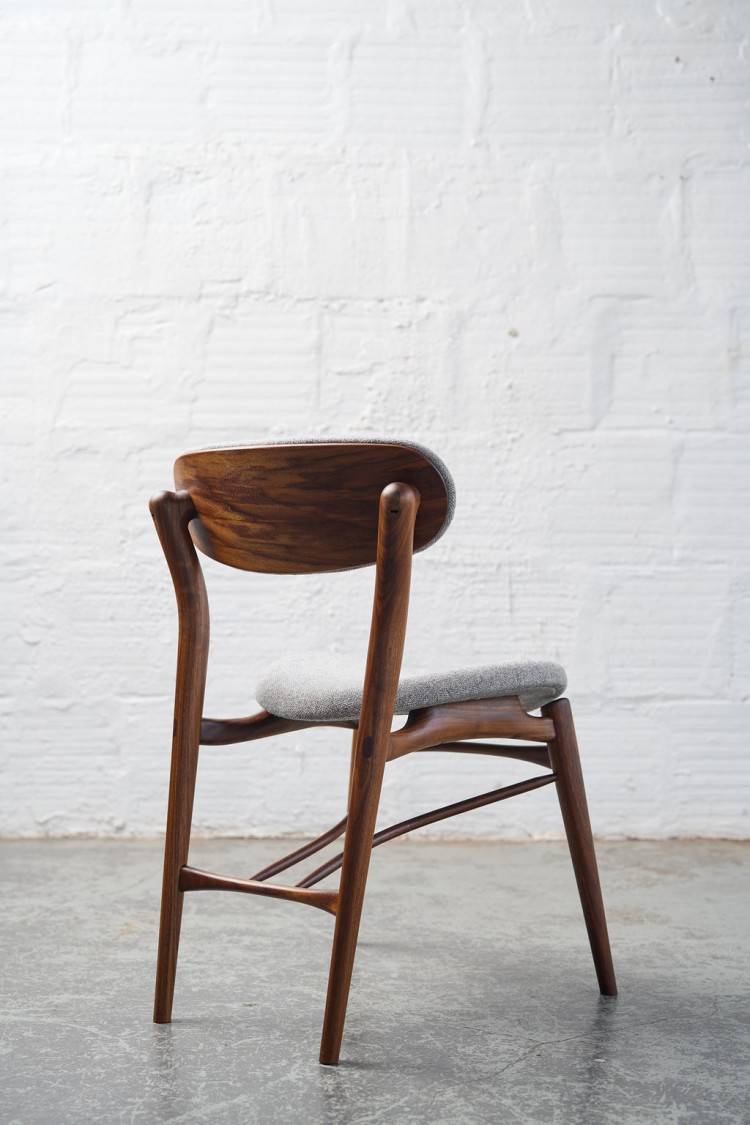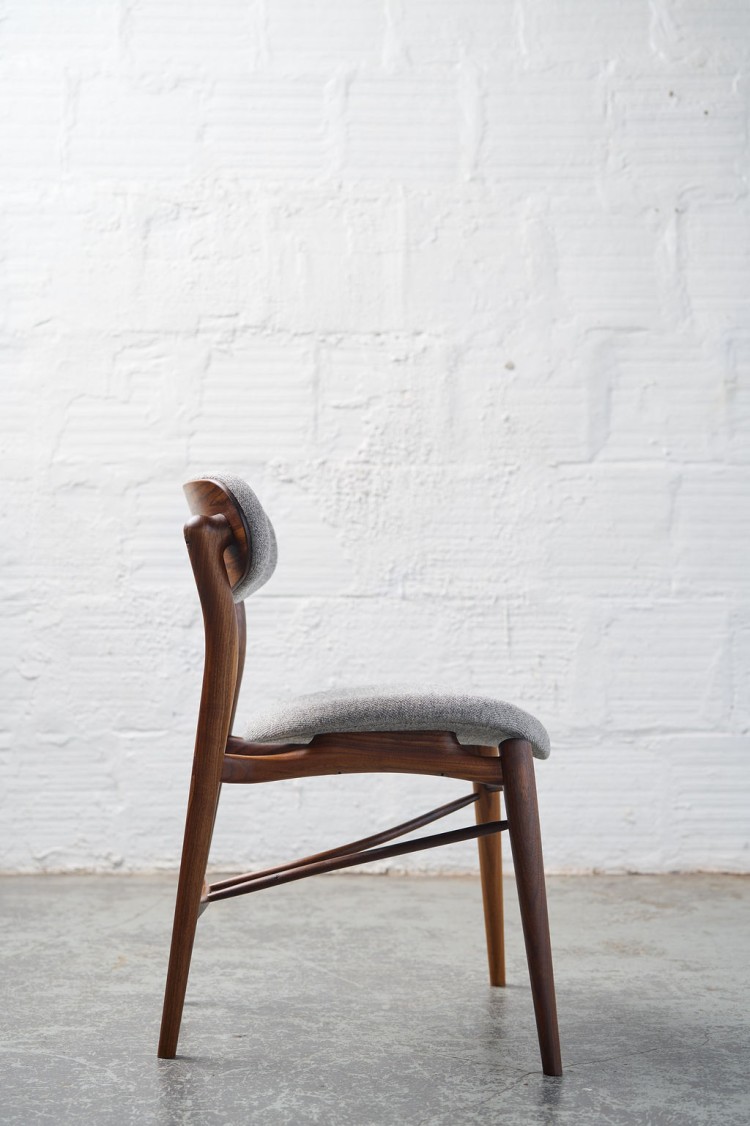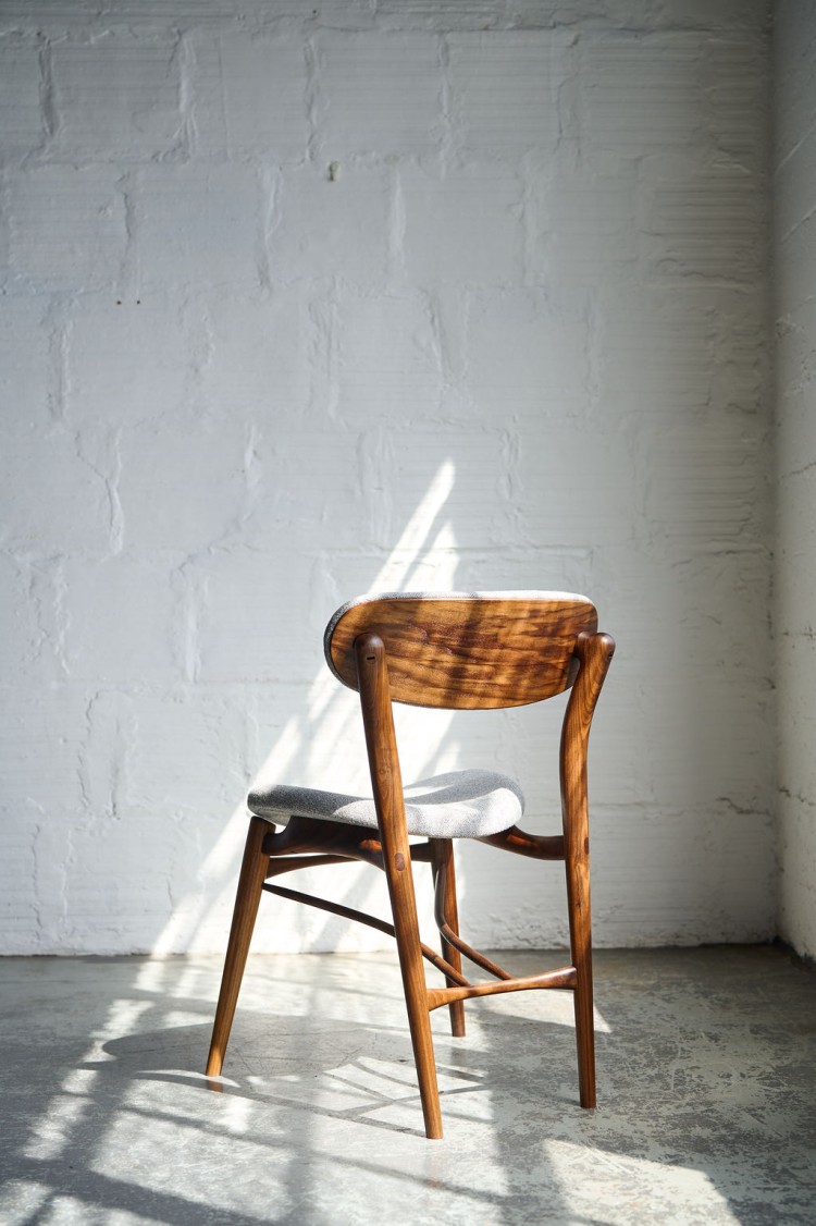 The fjoon occasional/dining chair features a vacuum-laminated upholstered seat with a sweeping compound curve, stepped mortise-and-tenon joinery with a friction wedge, and a patent-pending wood plug system which allows for re-upholstery down the line without having to destroy / re-fabricate any chair parts.