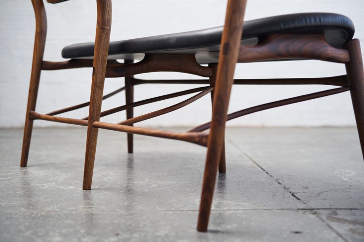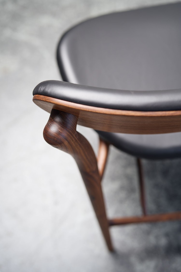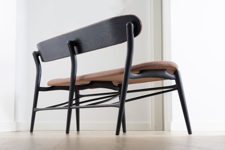 The fjoon settee features a vacuum-laminated upholstered seat with a sweeping compound curve, stepped mortise-and-tenon joinery with a friction wedge, and a patent-pending wood plug system which allows for re-upholstery down the line without having to destroy / re-fabricate any chair parts.