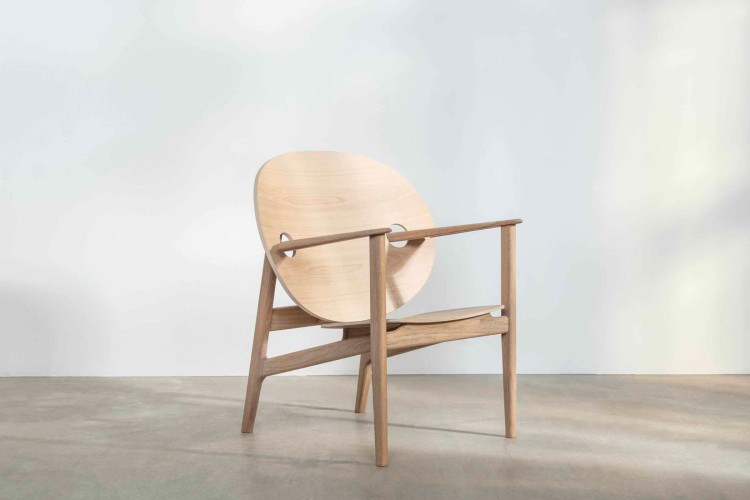 The Iklwa Lounge Chair is part of the Iklwa collection. Each comprised of powerful, spear-like forms, the collection also includes a large throne-like chair and side table crafted in ash and oak, available in either an Earth Orange stain or classic whitened oil.