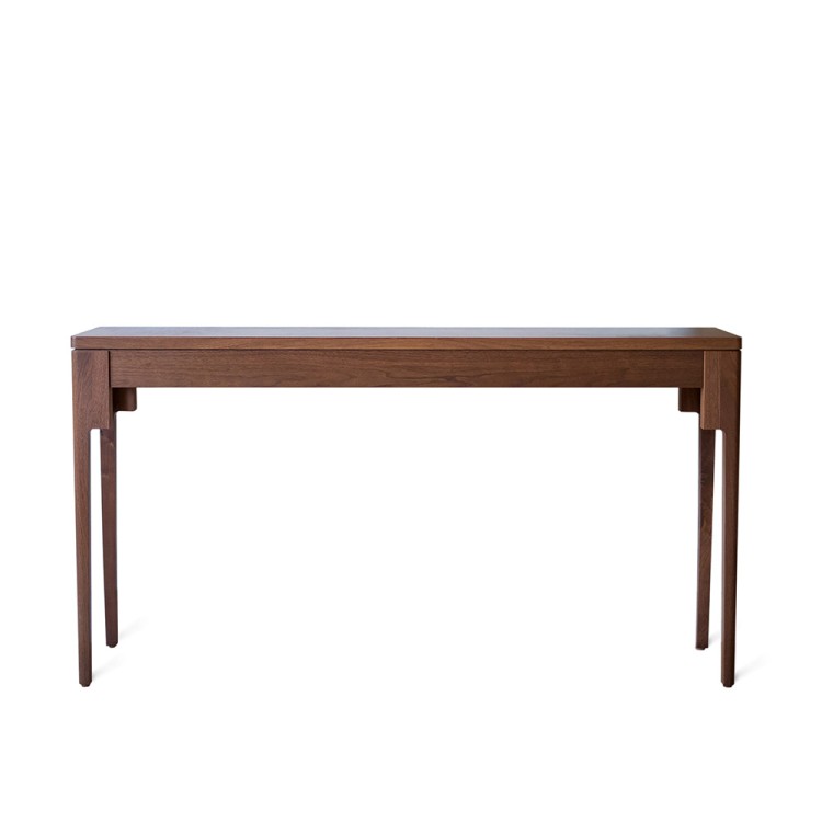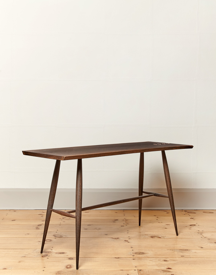 Naturally oxidized subtle live edge oak top with slender turned legs and handcrafted copper staples.