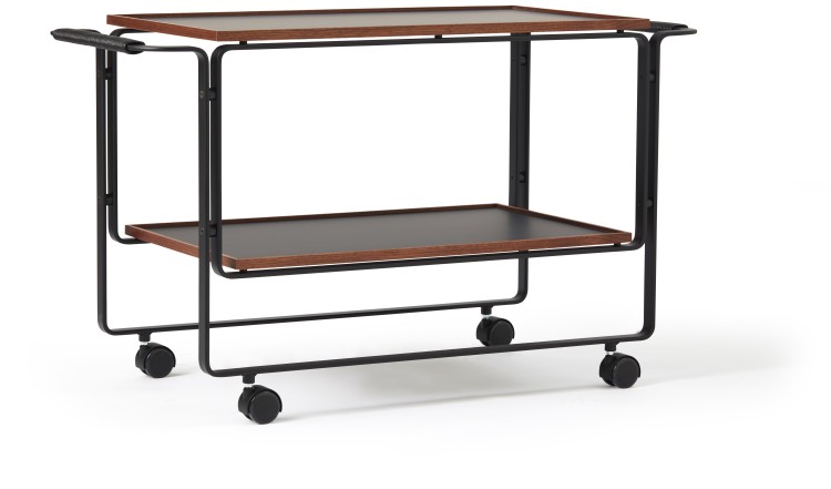 Frame in black powder coated steel, black tray with Walnut edges and handgrip in black leather.
