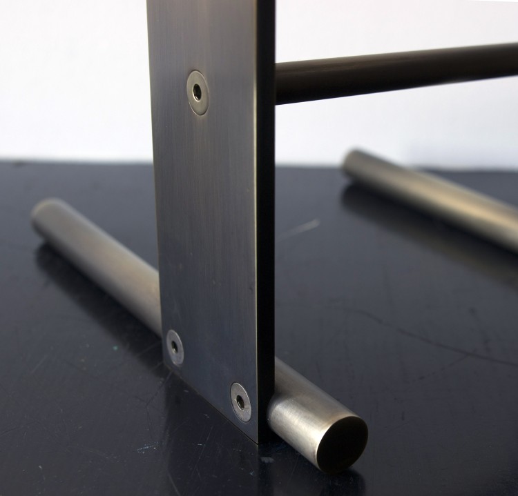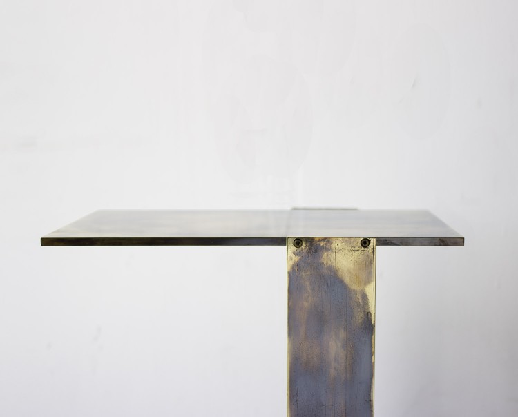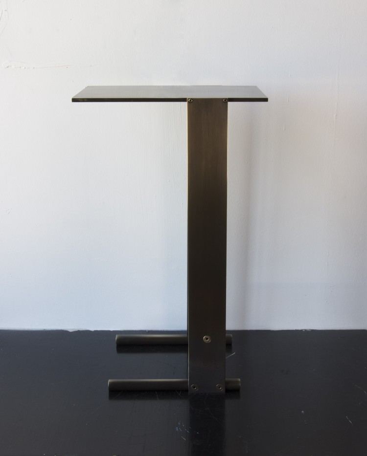 Solid machined brass with recessed hex-head fasteners. Rectangular cantilever design is a play on connections and lightness in a solid metallic form. Petite sized to pull up next to a sofa or reading chair; well suited as a drink tray or book stand.