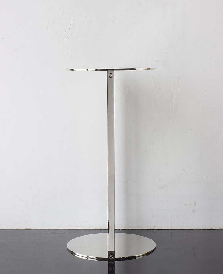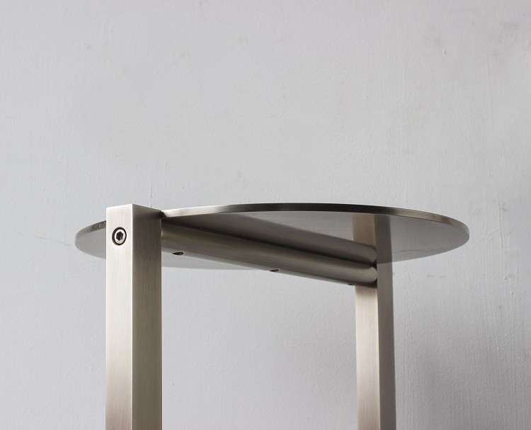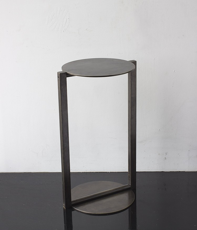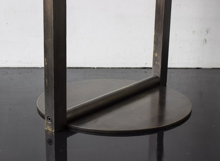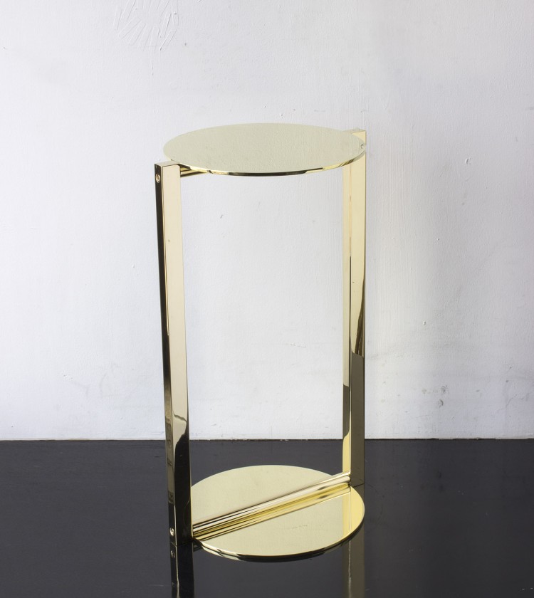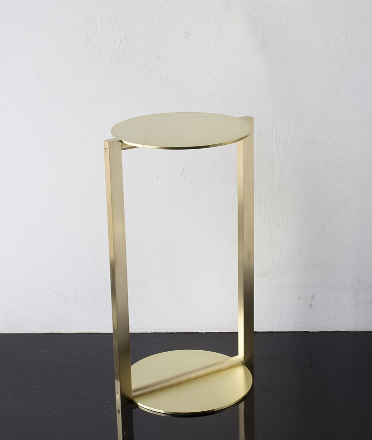 Solid machined brass with recessed hex-head fasteners. The suspended lever design is a play on lightness and visual illusion in a solid metallic form. Petite sized to pull up next to a sofa or reading chair; well suited as a drink tray or book stand.