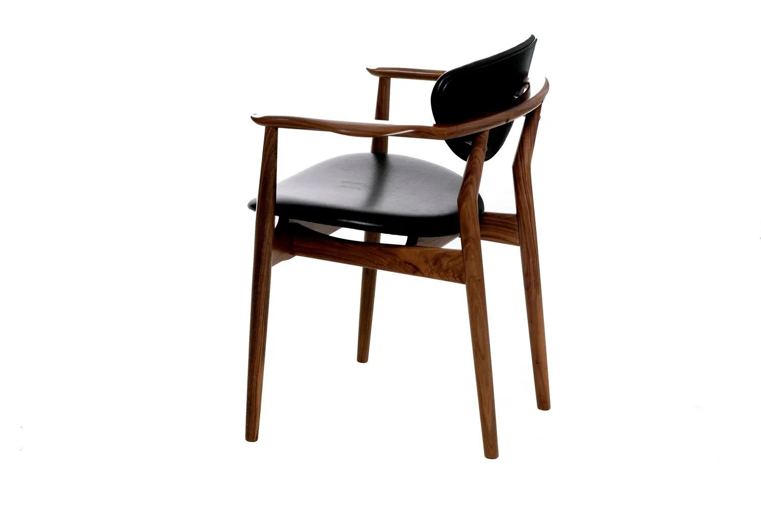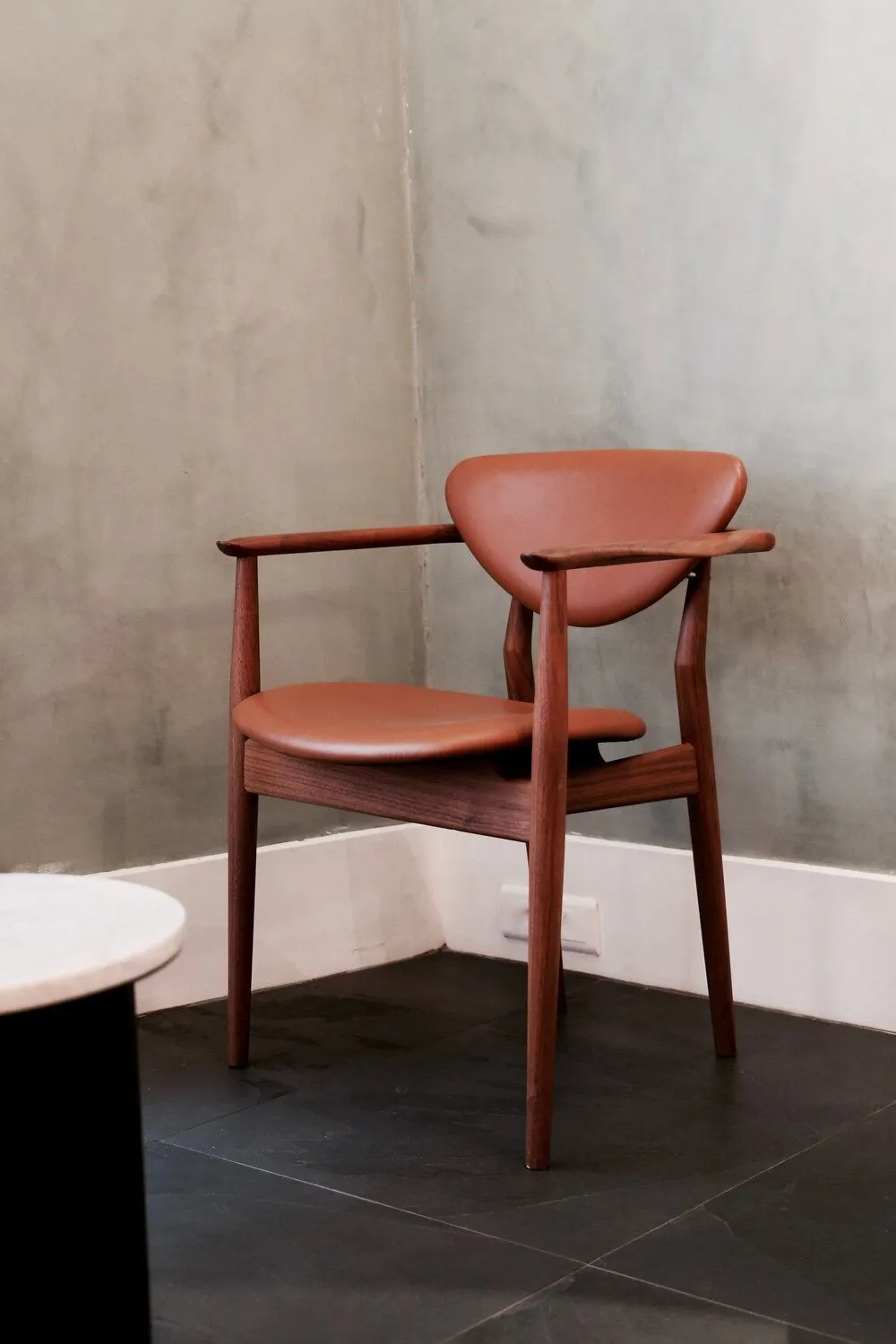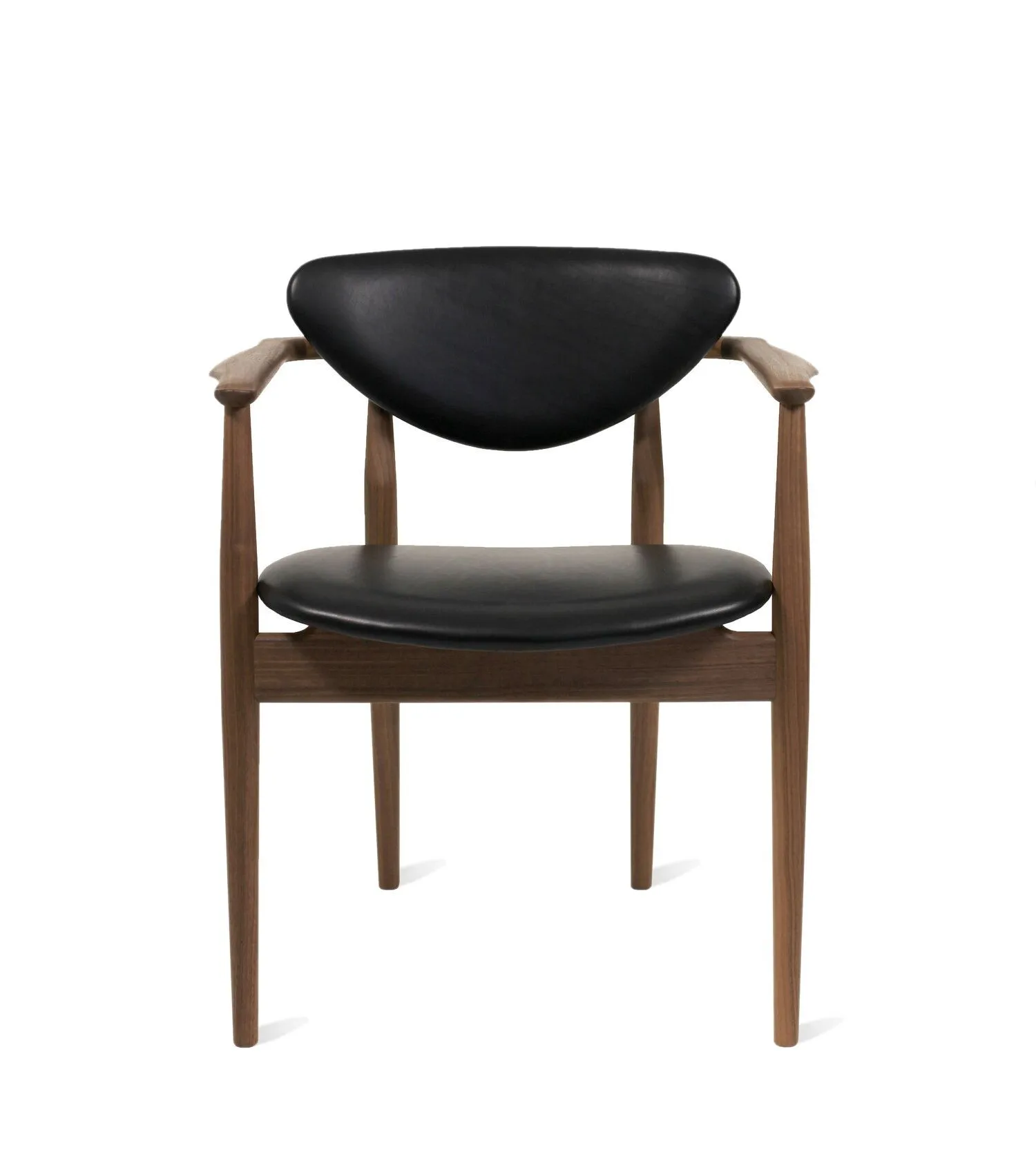 The 109 Chair was designed by Finn Juhl in 1946 and was originally manufactured by cabinetmaker Niels Vodder. It is particularly the detailed armrests that make this chair unique. These armrests are intimately shaped to fit a small hollowing at the tip, which perfectly fits the plum of a thumb. The 109 Chair is functional in a dining setup at home as well as in a restaurant, a hotel or in a conference room.