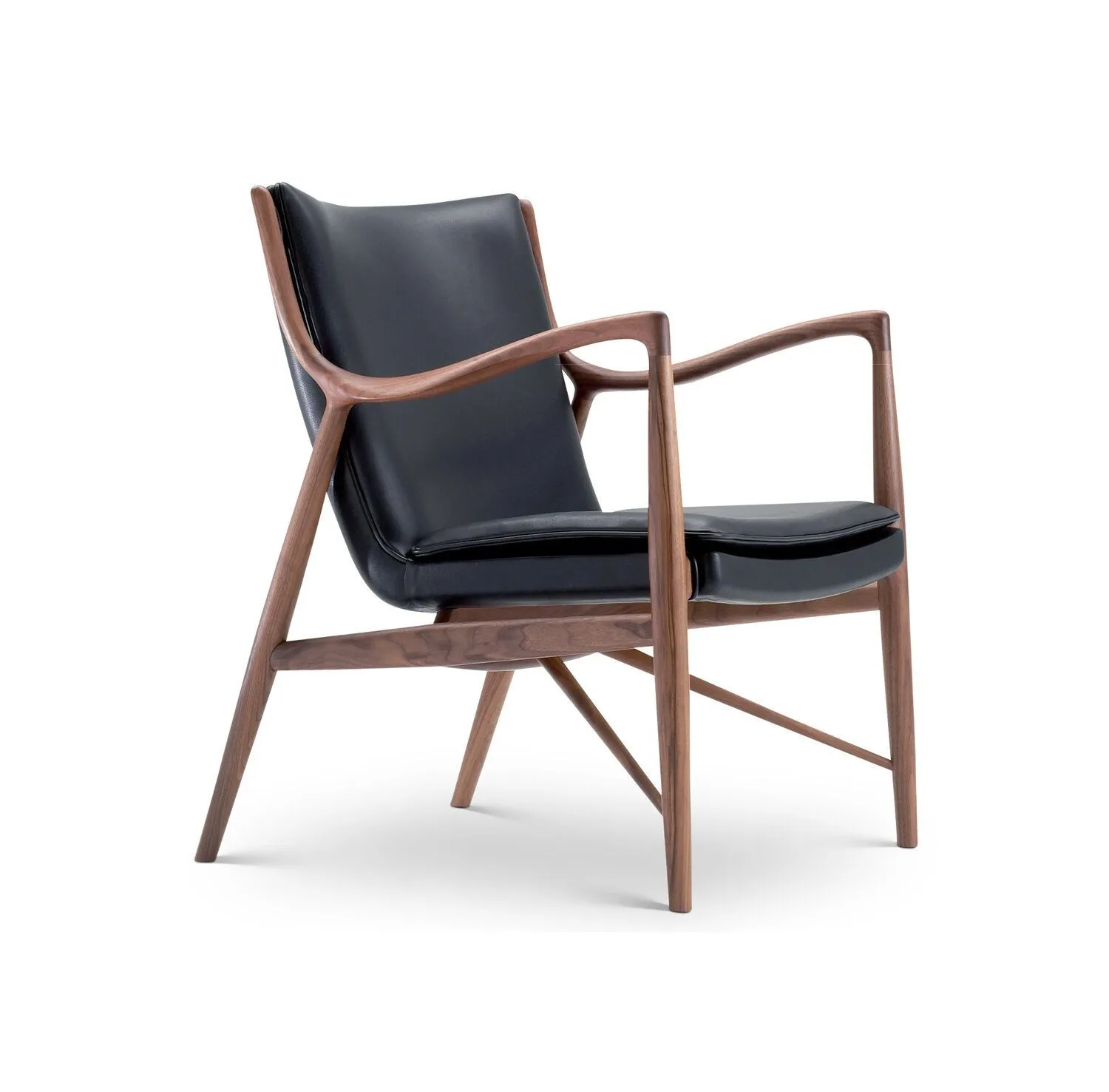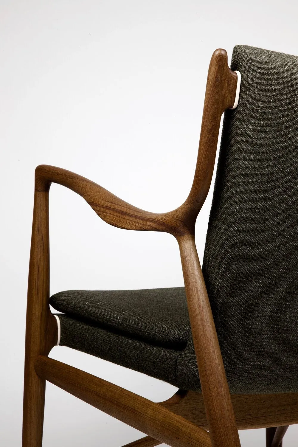 A few years after Finn Juhl’s debut at the Cabinetmaker’s Guild Exhibition he became increasingly interested in applying wood as the dominant shaping material, rather than ‘hiding’ it under a cover of upholstery. When he designed the 45 Chair it had become his objective to create a chair that was almost self-explanatory in its construction and he became one of the first to clearly disconnect the upholstered areas from the wooden frame. The result was an elegant and tantalizing expression that came to characterize Finn Juhl.