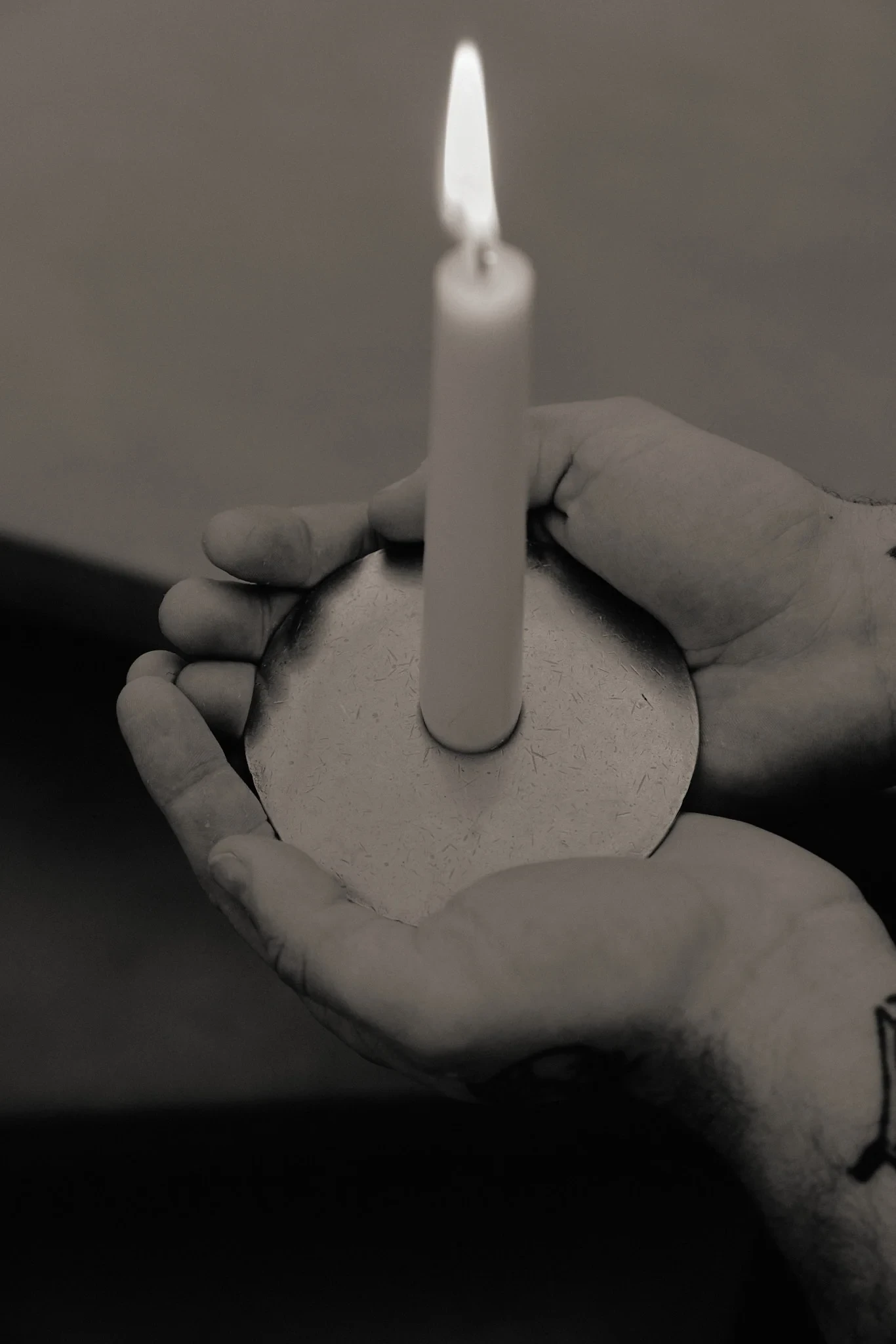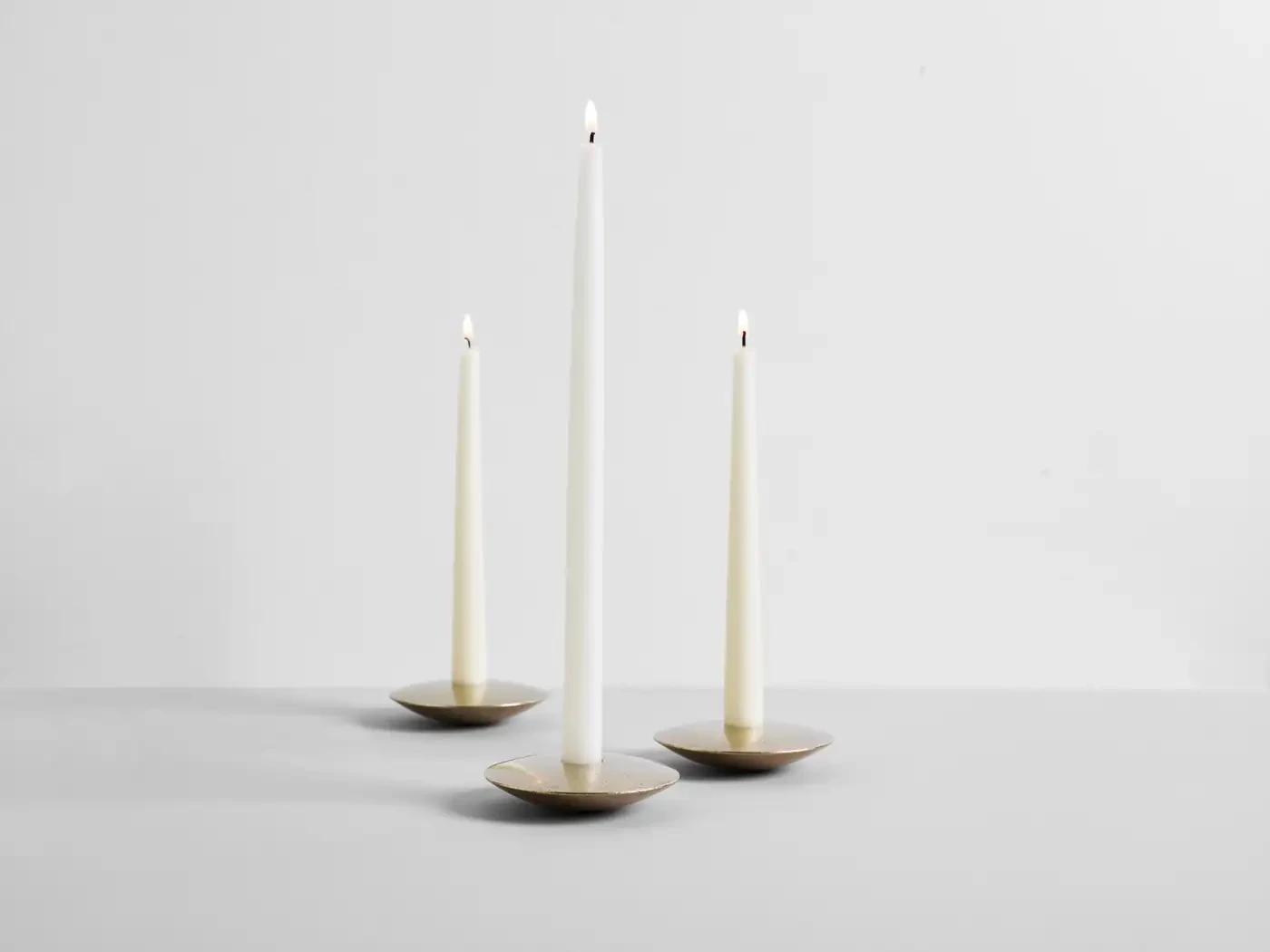 With a solid form and graceful, almond-shaped profile, the Alemendres Candle Holder* is manufactured from hand-poured brass, and designed to hold one standard-sized window candle. For light rendered with a subtle honey aroma, and without soot or drips, we encourage use of beeswax candles.