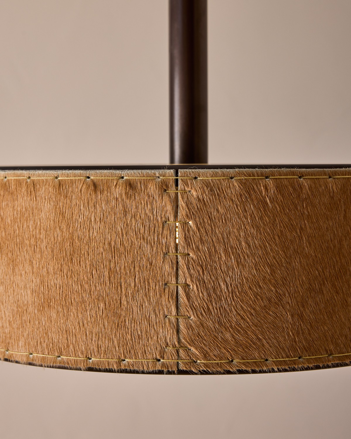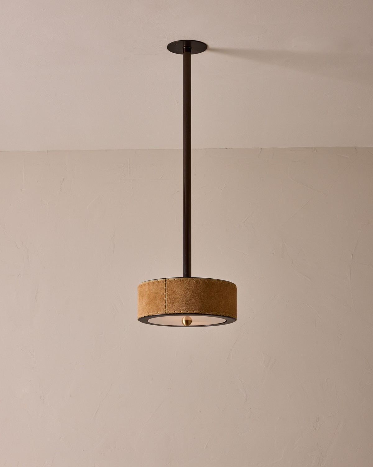 The Alina Lighting Collection brings a modern Bauhaus influence to vintage lighting design. Crafted with natural hide leather, the collection embraces the organic beauty of each piece, reducing environmental impact by minimizing leather processing. Perforations along the top create a distinctive accent while delivering functional light. The juxtaposition of leather stitching against metal offers an intriguing, textural detail, complemented by brushed satin brass accents. The softly curved, ovoid design draws inspiration from 19th-century French oil jars. Available in a variety of hues and styles, The Alina Collection offers a versatile aesthetic that complements a wide range of interiors.