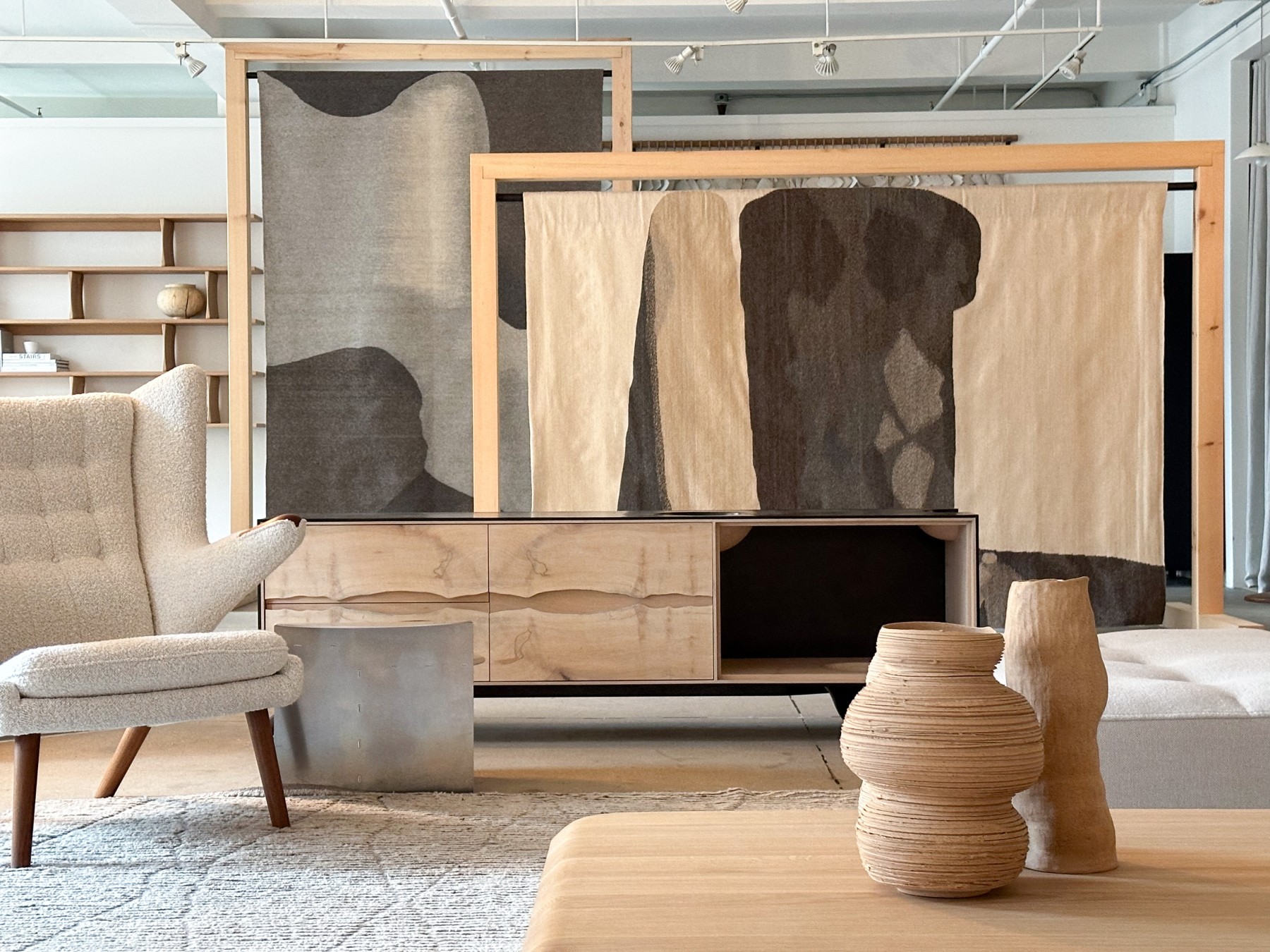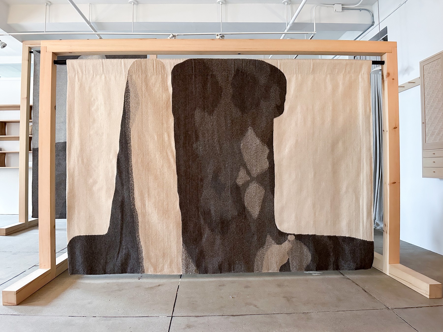 The shading from Forcella’s original graphite pencil sketches of the rock formations is mirrored in the organic forms depicted on the tapestries. It is a balance of composition and depth. This collection, with its subtle tones and textural variations in the wool, complements FAIR’s aesthetic.