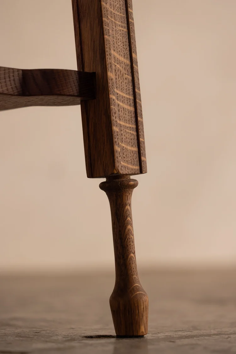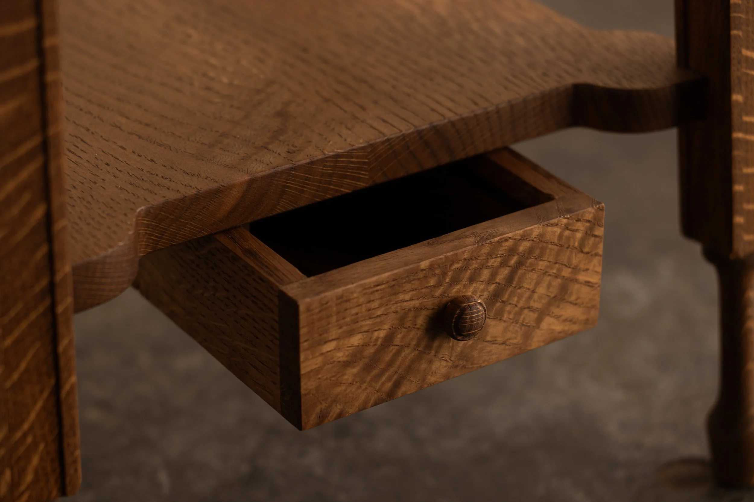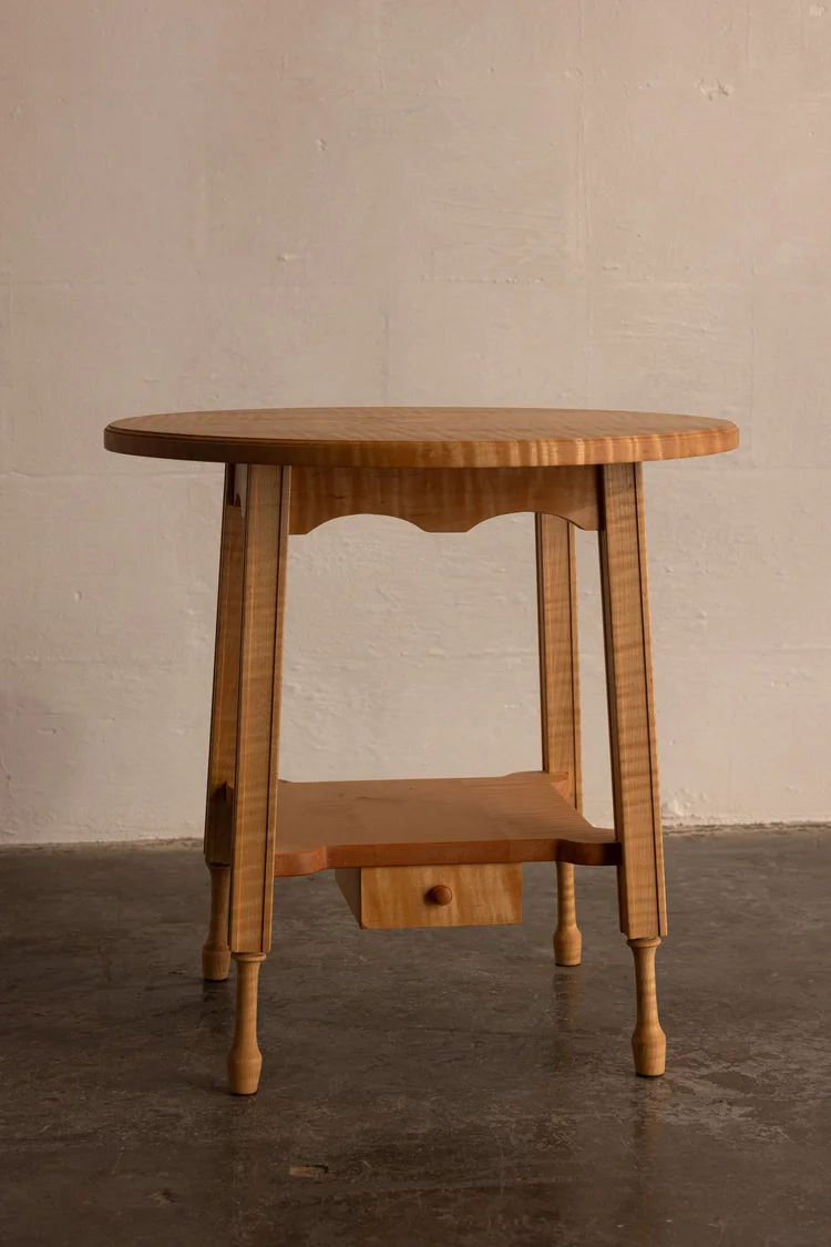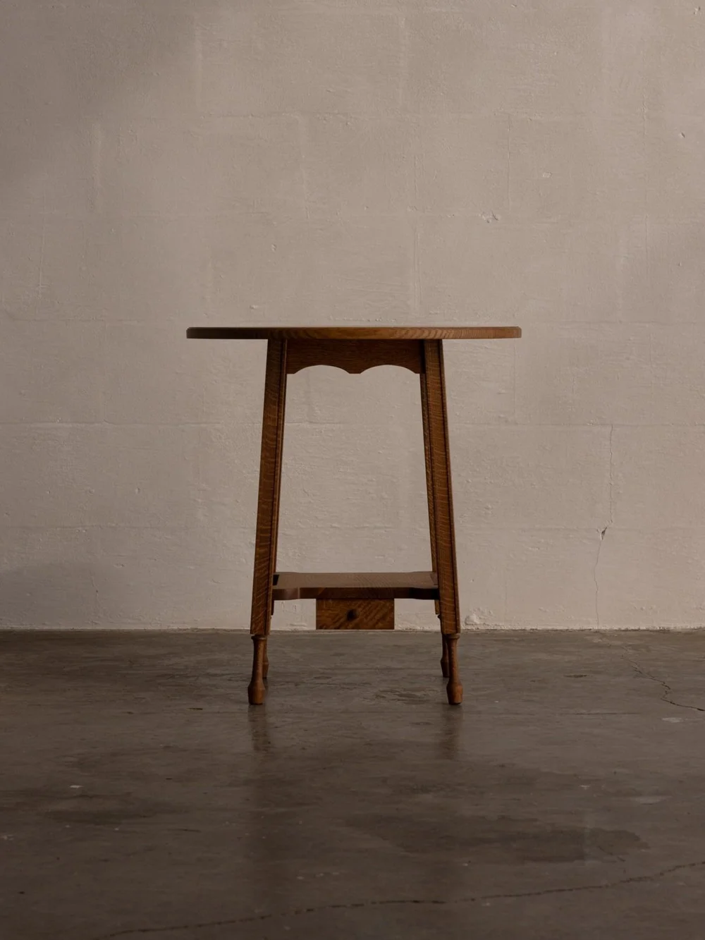 Inspired by Sheraton and Arts and Crafts design, this table exemplifies quality American craftsmanship. Featuring hand-turned legs and precision joinery for its floating bottom shelf, every detail is thoughtfully executed. Constructed entirely from solid wood, it is designed with both beauty and durability in mind, ensuring it will be cherished for years to come.