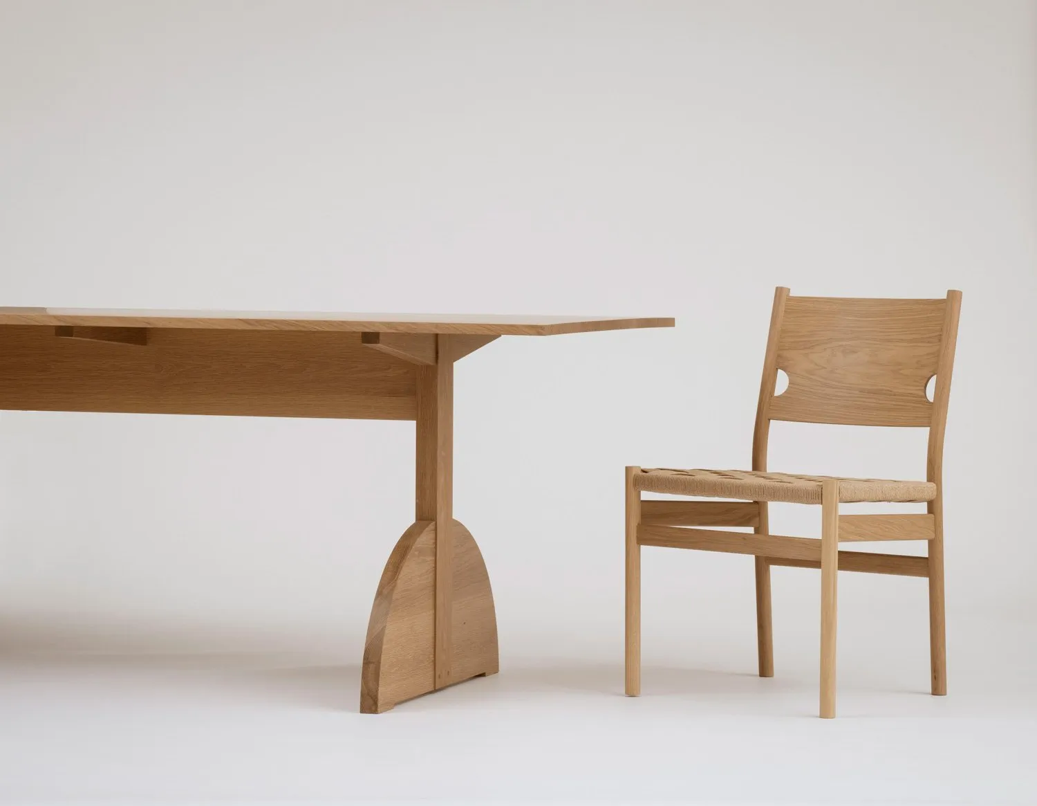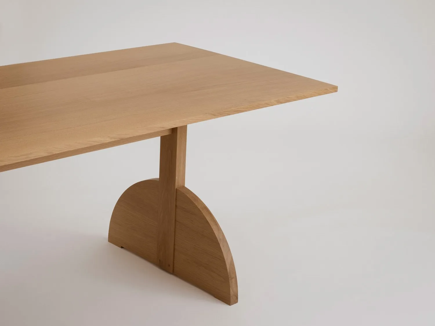 Solid wood joinery is highlighted in this trestle style table. A dramatically arced foot profile is pegged and joined onto a stout leg to create a memorable and rugged profile.