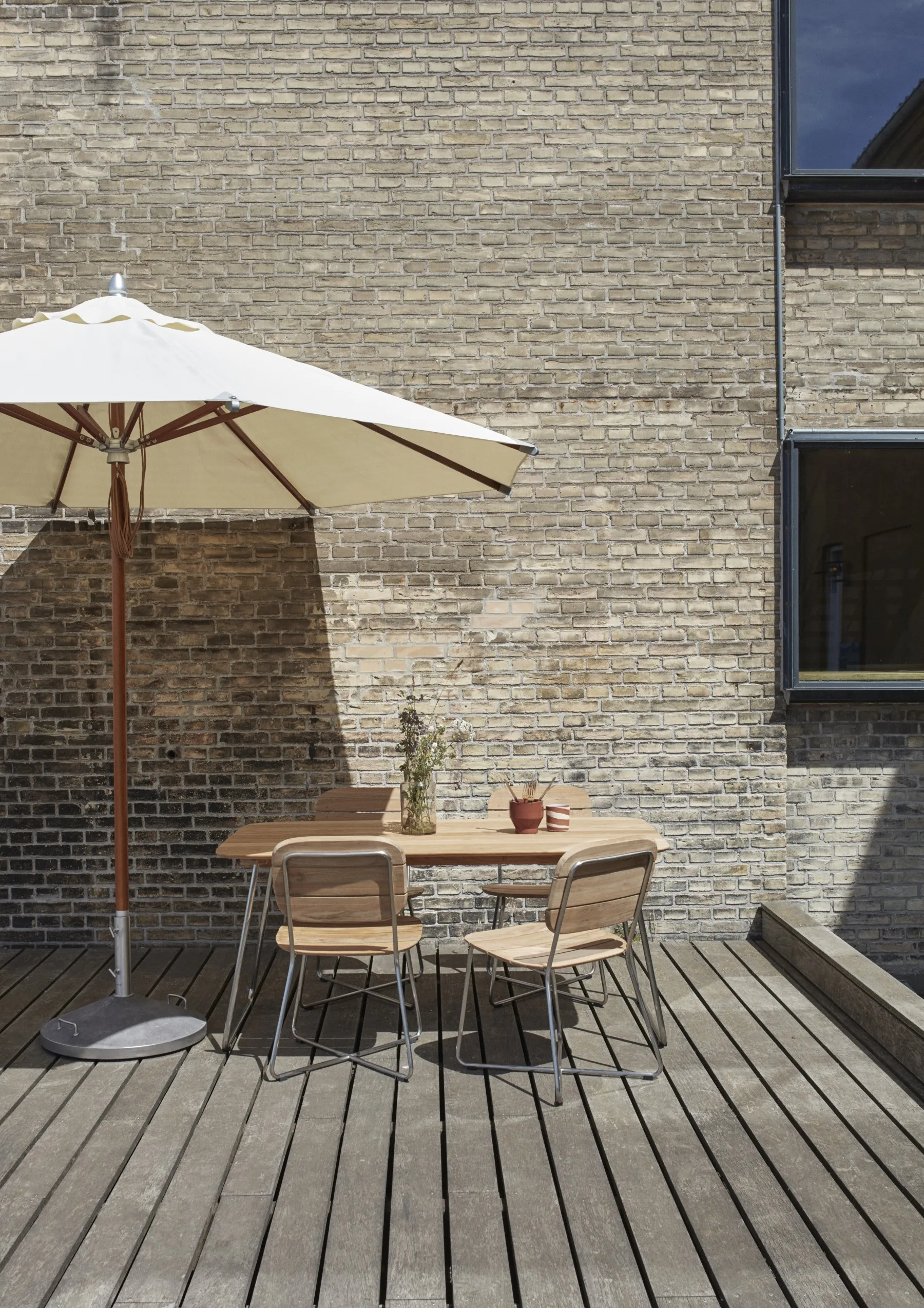 Create cool shade with the Atlantis umbrella and relax with outdoor dining under the summer sun. While the textile has been leather-reinforced to enhance its strength, the foot of the wooden pole is metal-reinforced to protect against wear and scratches when placed in the foot. The top metal fixings and protective parts of the foot are made of aluminium for a more exclusive finish. The wood is lacquered and made of 100% FSC-certified kapur wood from Indonesia. A double-pulley system makes it easy for everyone to fold up the umbrella. UV protection: UPF50+, the maximum sun protective rating achievable for textiles.