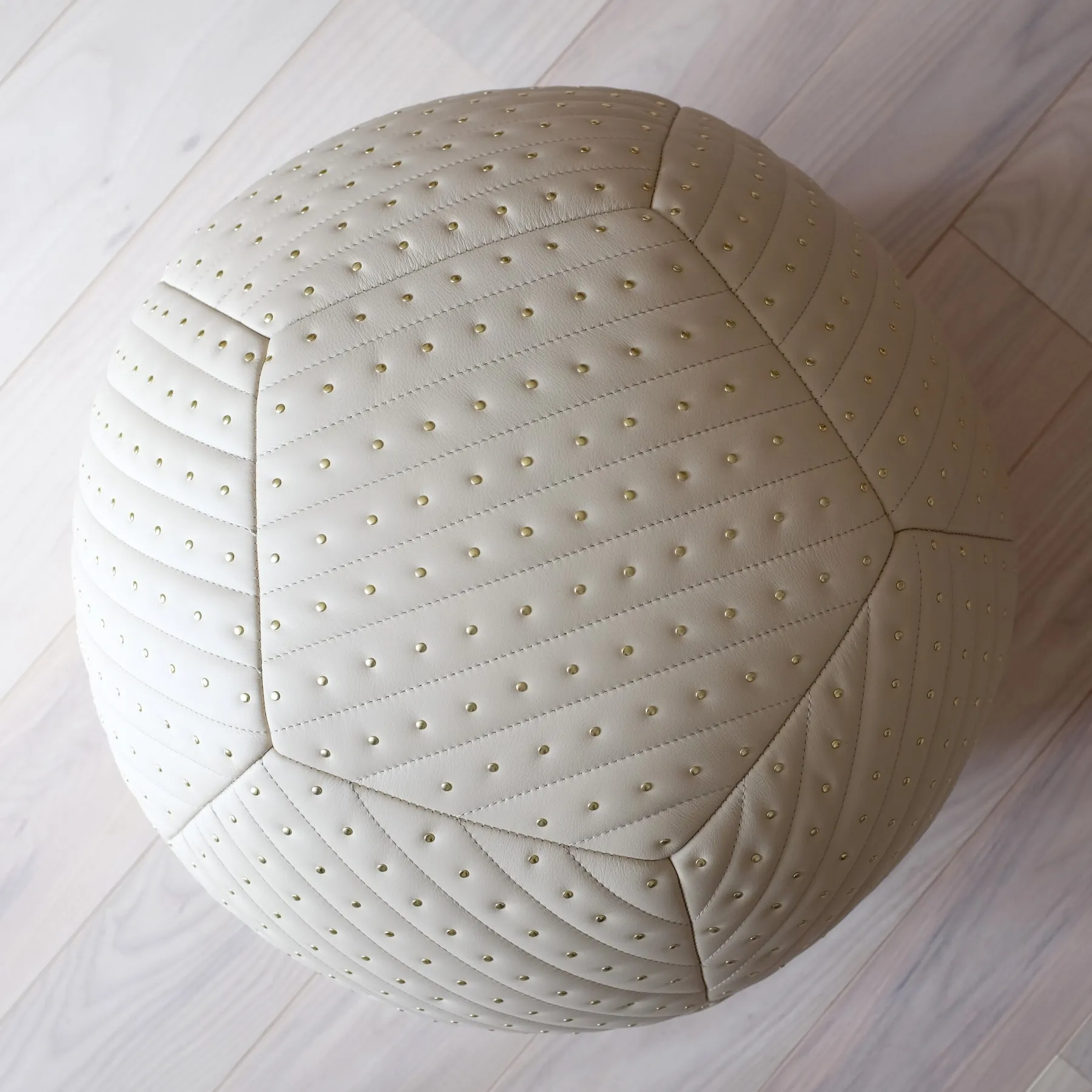 Round, sculptural and uniquely abstract, crafted with supple European leather, the Banded Studded Ottoman is constructed with converging topstitched panels and hand-set rivets.