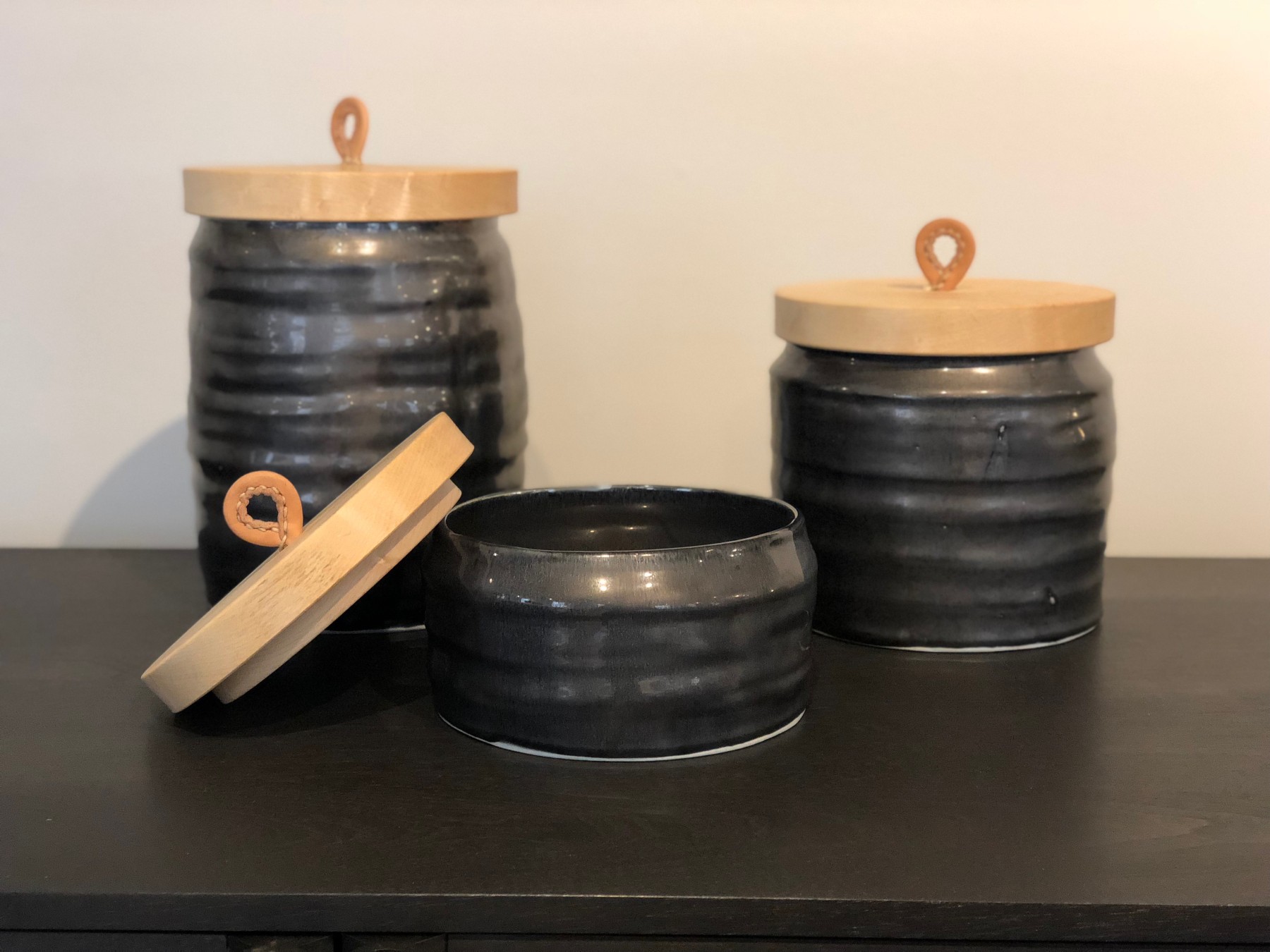These countertop-worthy canisters tick all of the boxes. Functional, tactile, beautiful. We've combined our favorite materials - porcelain, highly-figured wood and leather to create these show stopping work horses. The porcelain vessels are cast from the original hand thrown pieces.