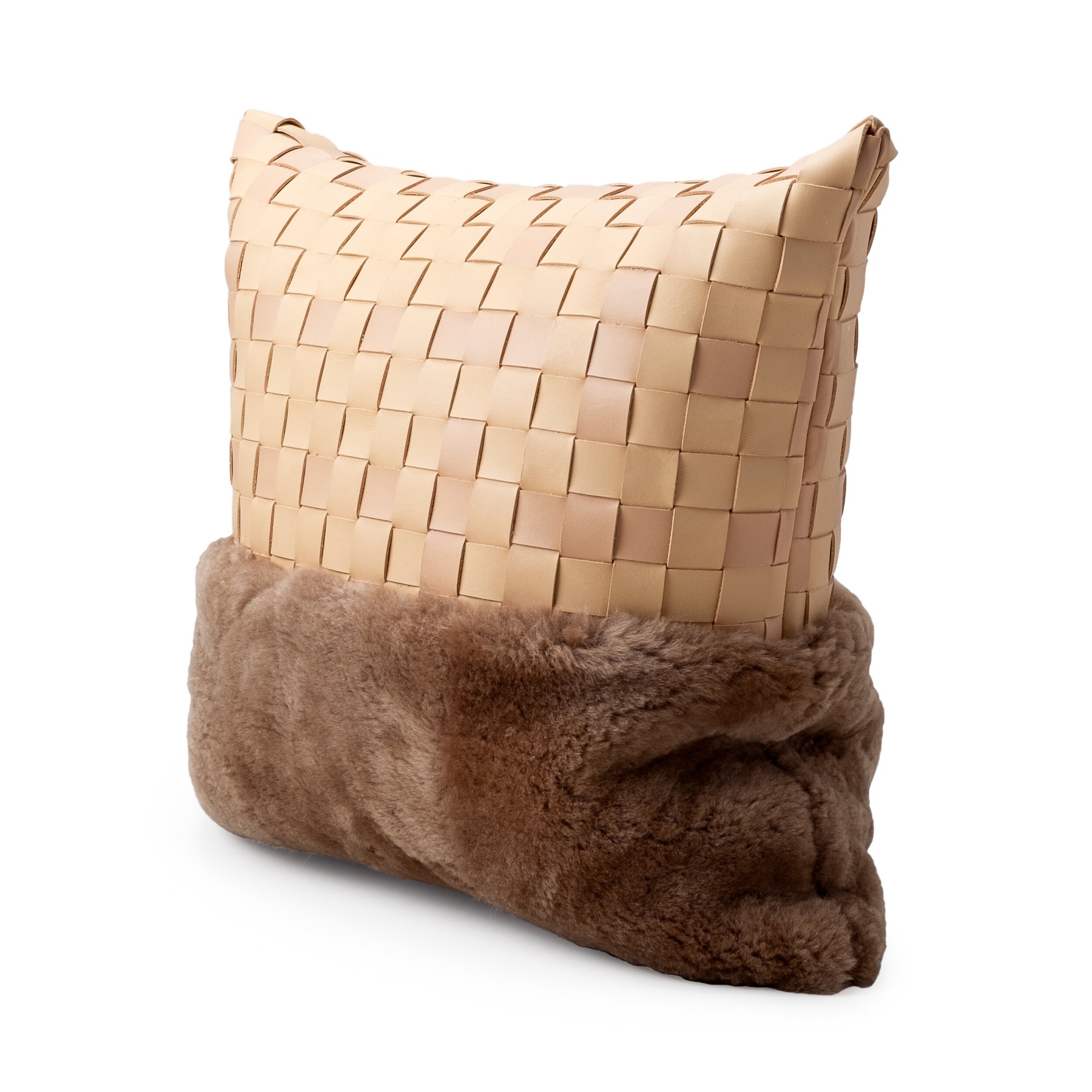 Constructed with thick strips of belting leather, the upper section of this throw pillow is inspired by a woven basket, whereas the lower section holds its own in contrast with a soft shearling base. A unique and luxurious addition to your bedroom or living space.