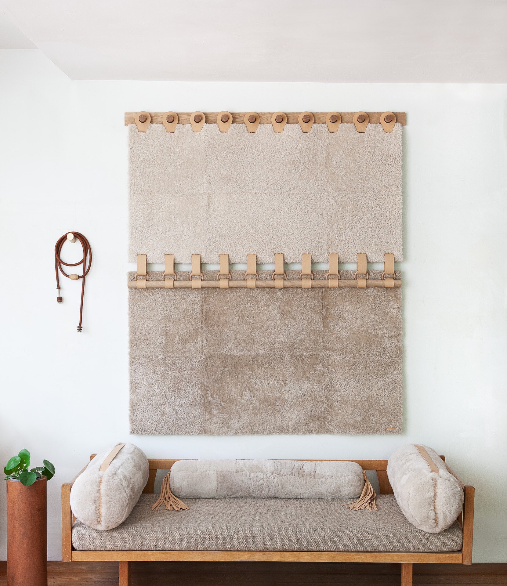 Shearling, Vegetable Tanned Leather, Firm Foam Fill.