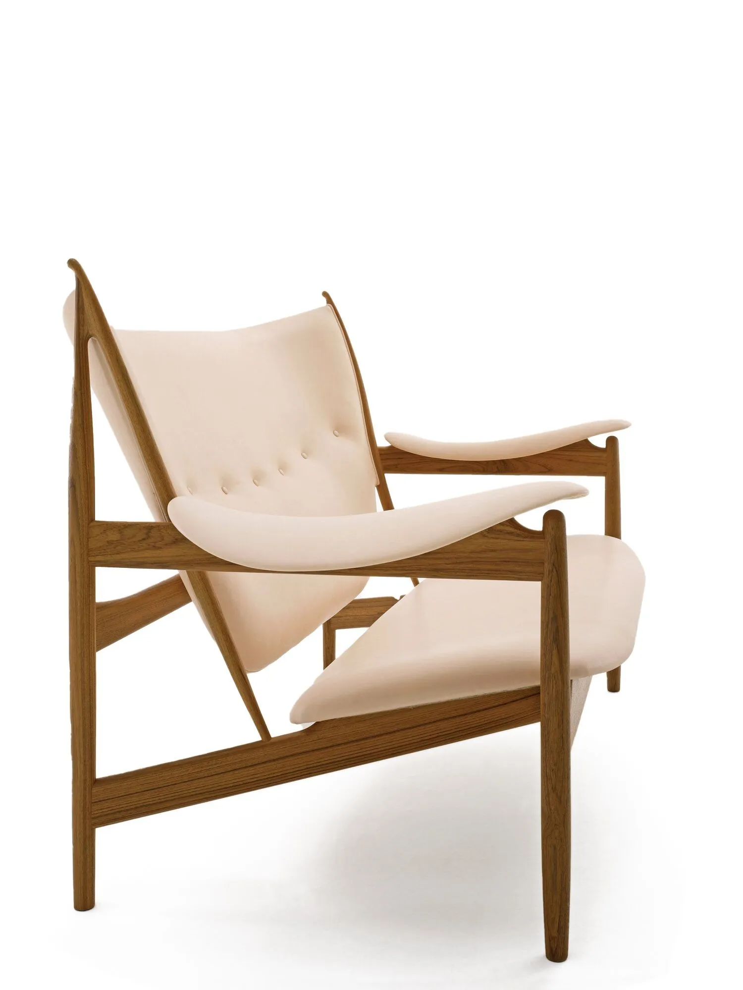A few years after Finn Juhl’s debut at the Cabinetmaker’s Guild Exhibition he became increasingly interested in applying wood as the dominant shaping material, rather than ‘hiding’ it under a cover of upholstery. When he designed the 45 Chair it had become his objective to create a chair that was almost self-explanatory in its construction and he became one of the first to clearly disconnect the upholstered areas from the wooden frame. The result was an elegant and tantalizing expression that came to characterize Finn Juhl.