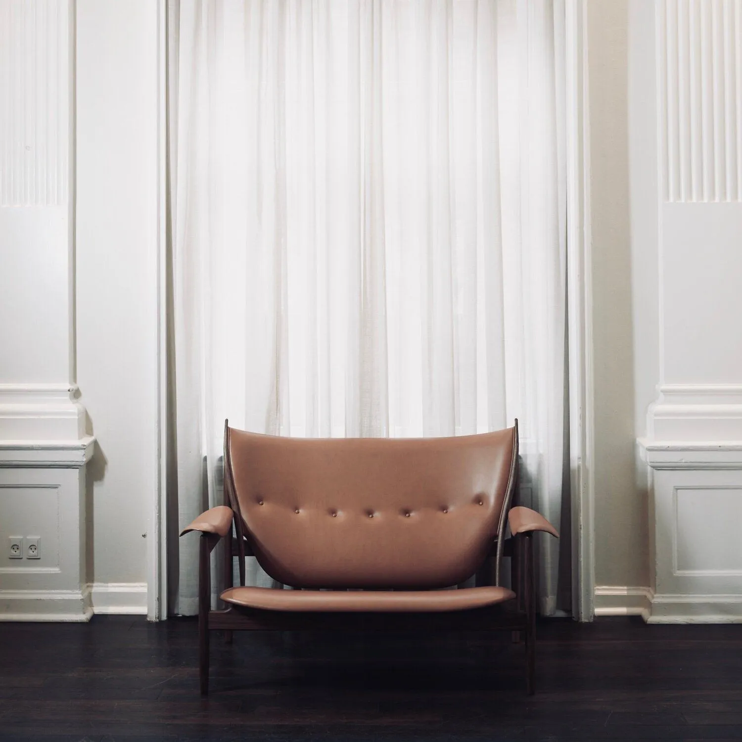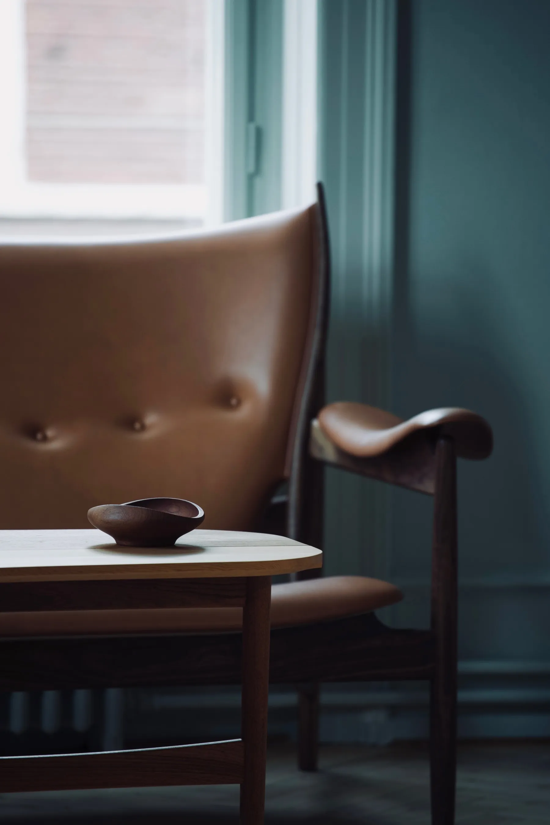 Alongside the impressive Chieftain Chair, Finn Juhl and cabinetmaker Niels Vodder also introduced the Chieftain Sofa in 1949. Today, this extraordinary piece of furniture is manufactured in a very exclusive, handcrafted version in walnut or oak. The sofa is upholstered by hand in Denmark from extra large hides of the finest quality.