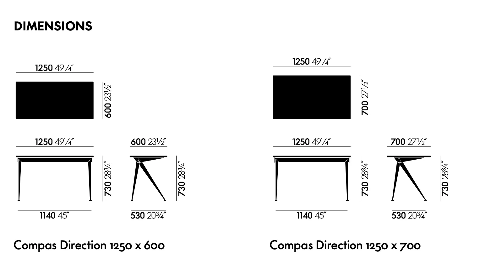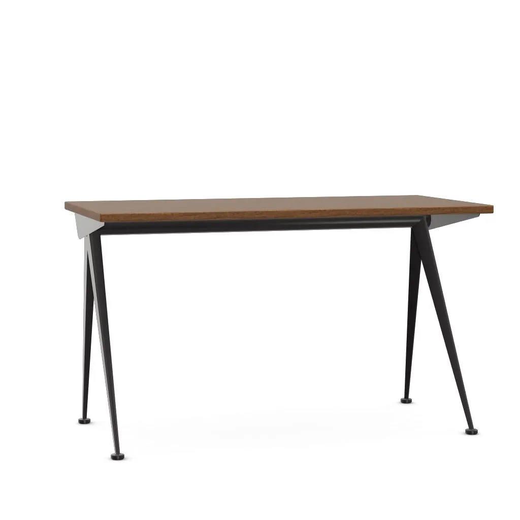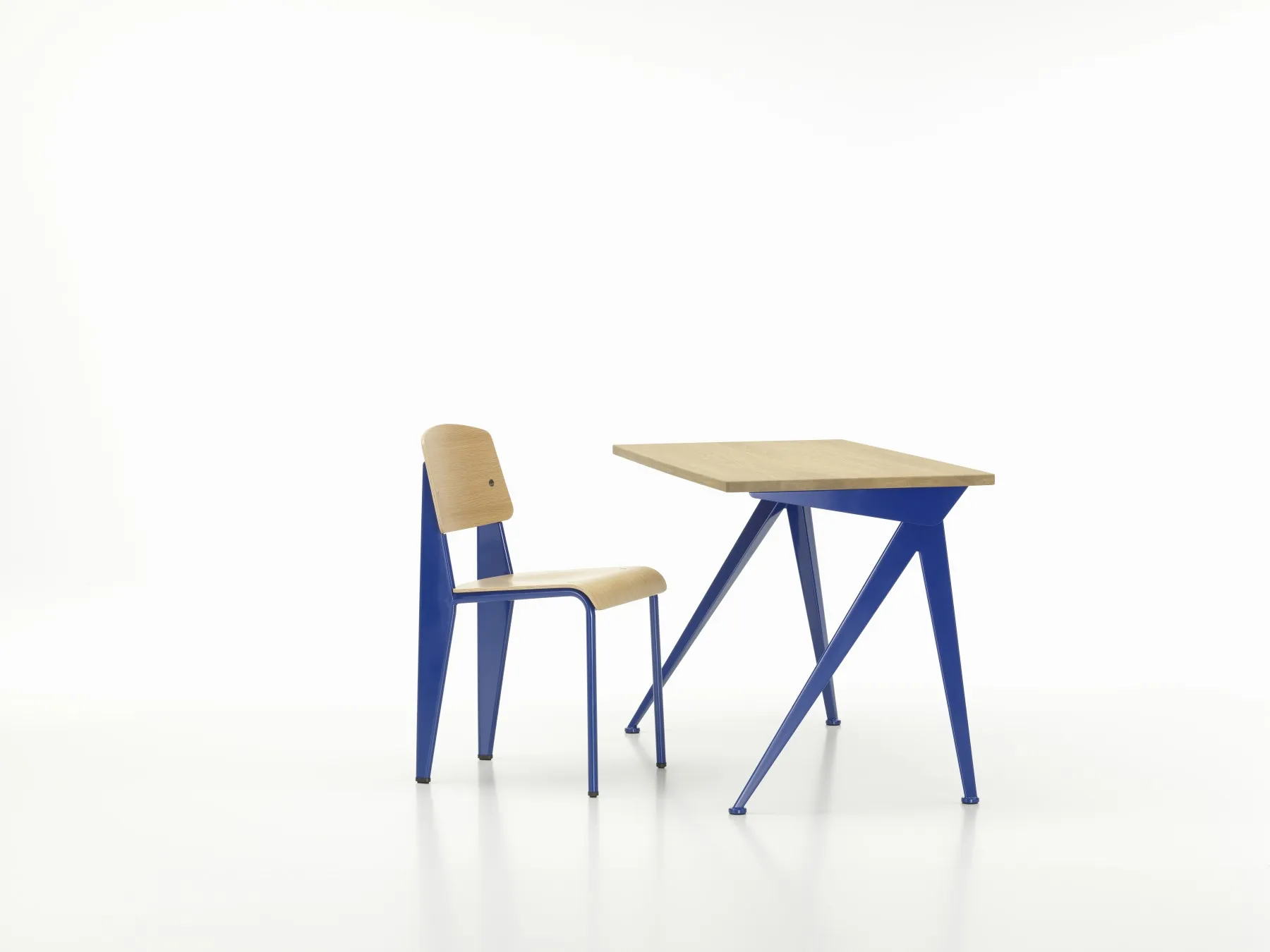 Compas Direction, a timeless desk designed by Jean Prouvé in 1953. Inspired by the structural principles for which Prouvé is renowned, its slender, elegantly splayed legs resemble the hinged arms of a compass – 'le compas' in French. Crafted with a solid wood tabletop, Compas Direction adds an individual touch to any space. Its compact dimensions make it perfect for the modern, paperless home office, combining functionality with classic design.