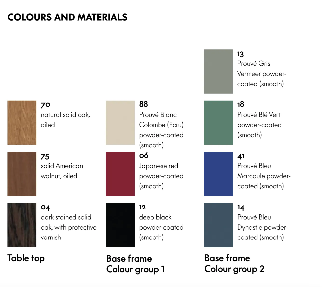 Base: bent sheet steel, powder-coated finish (smooth) in Blanc Colombe (Ecru) , Gris Vermeer, Blé Vert, Japanese Red, Bleu Marcoule, Bleu Dynastie or Deep Black
