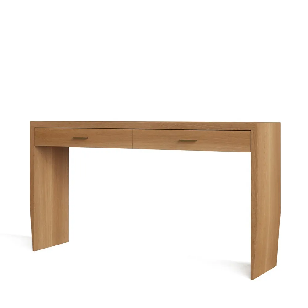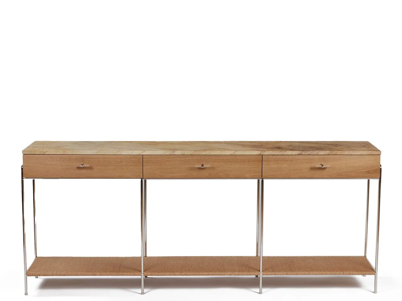This exquisitely crafted console table is inspired by the ancient Asian decorative arts. Its slender structure supports a perfectly cut, gorgeous slab of ¾”-thick St. Laurent marble.
