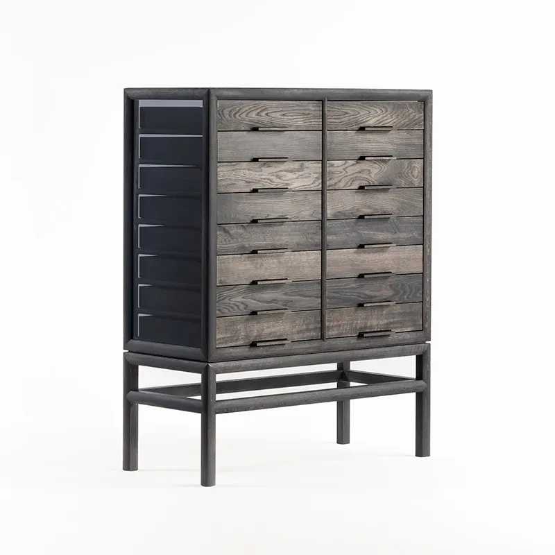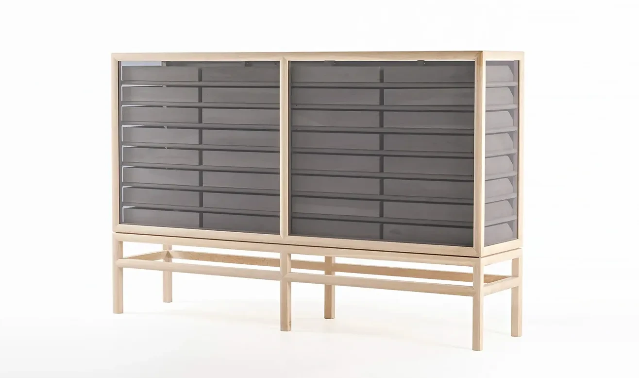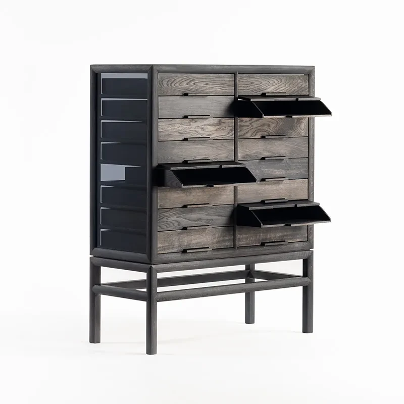 The analog sound of wood rubbing against wood is sure to evoke comfortable sensations. The smoked glass was inset into the back and sides of the cabinet, making the trays inside and the flap doors visible.