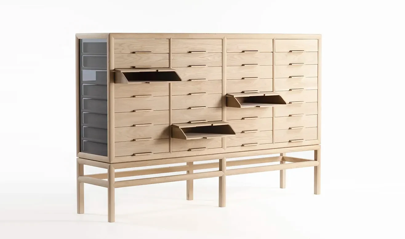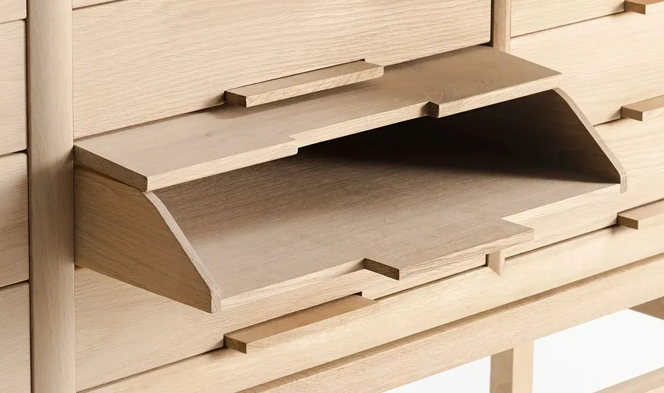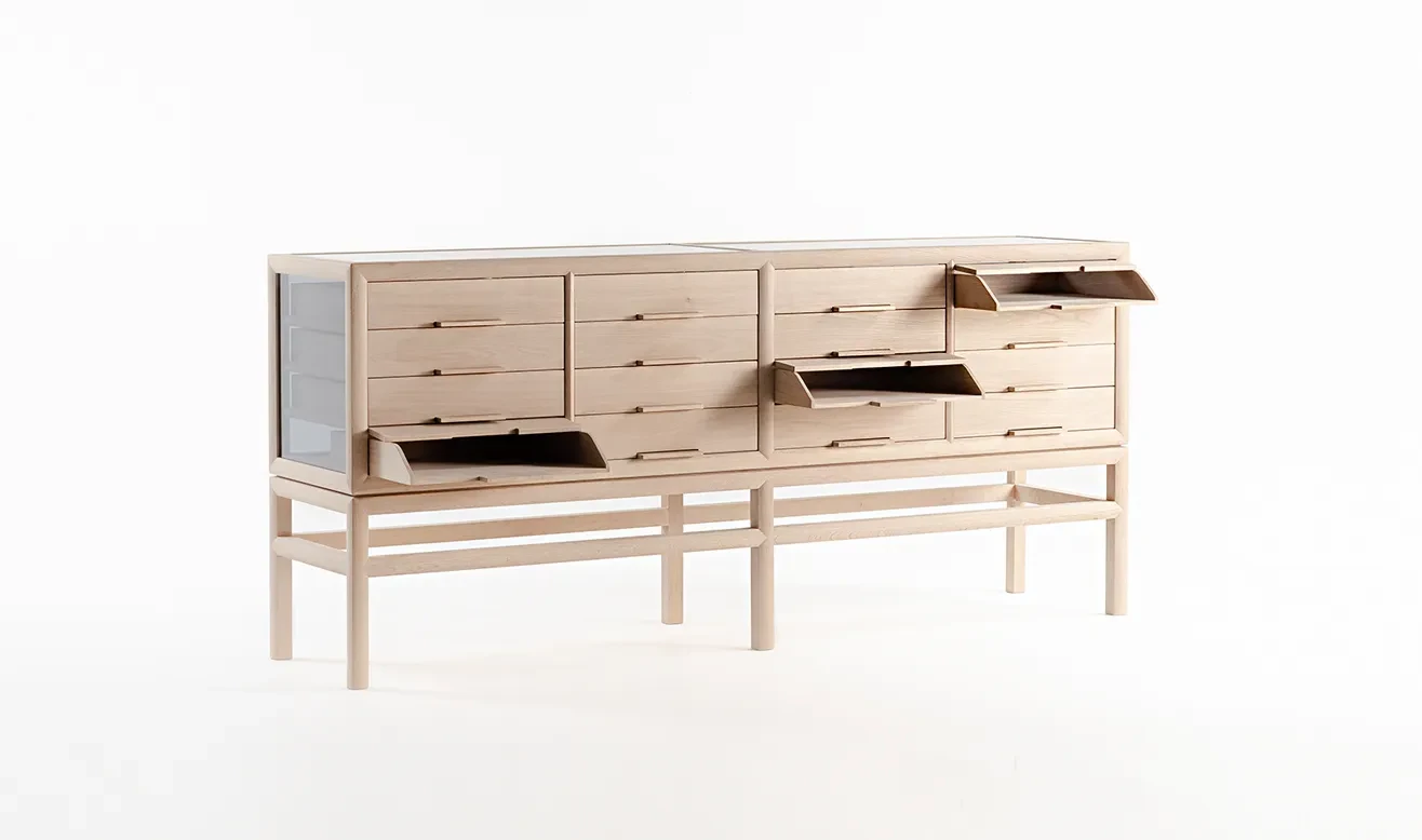 Pull-on the handles protruding from the cabinet’s front board, and the wooden trays inside the cabinet slide out. As you do this, the top-opening flap doors rise gently in coordination. Seeing this feels slightly strange, but in fact, we devised this mechanism based on ideas incorporated into old Japanese furniture and decided to create functional storage furniture using simple rather than complicated mechanisms.