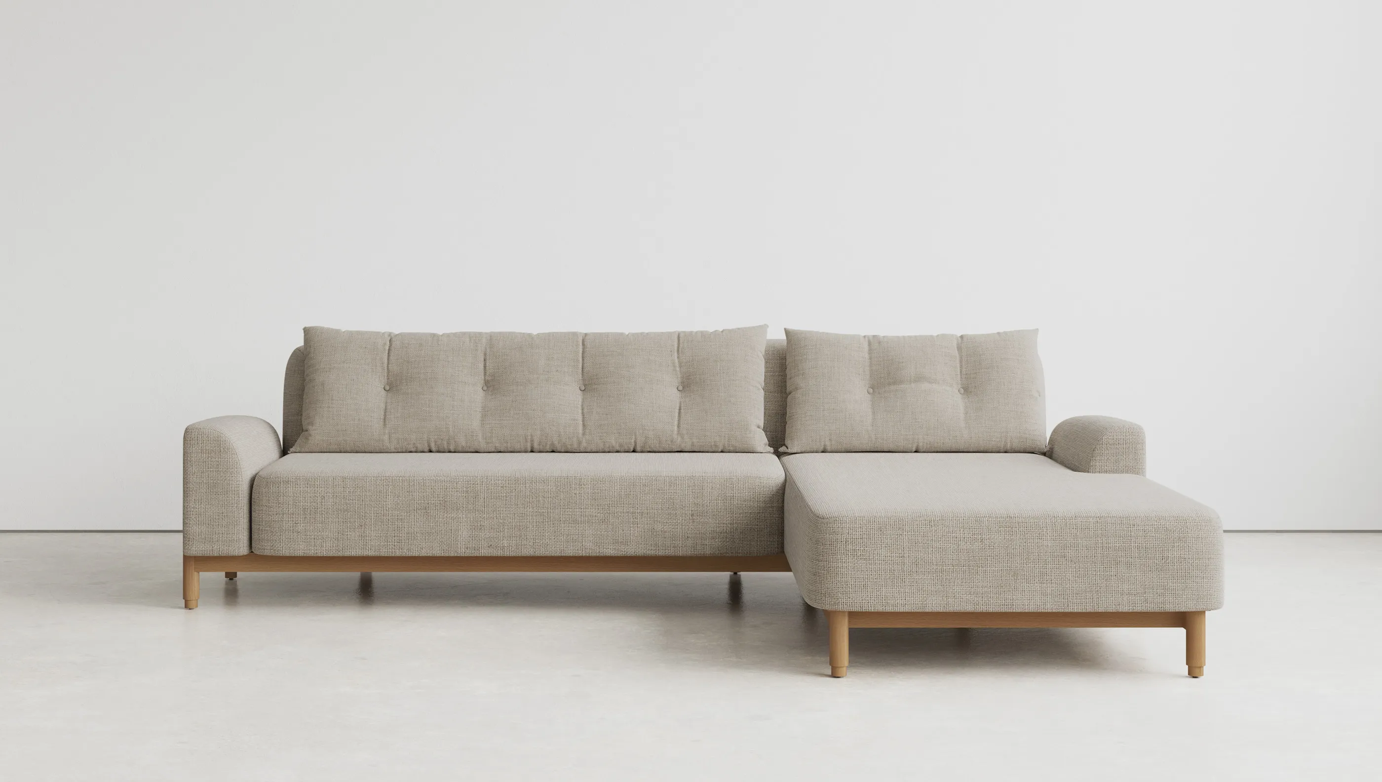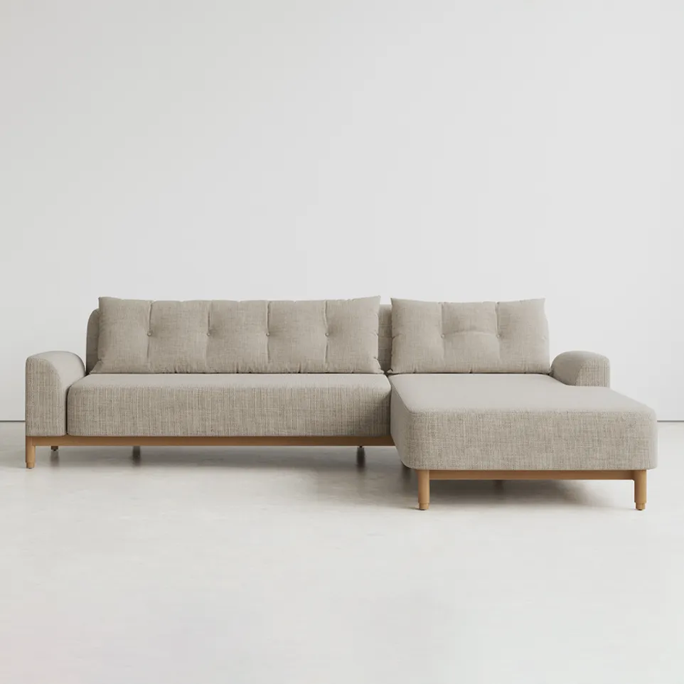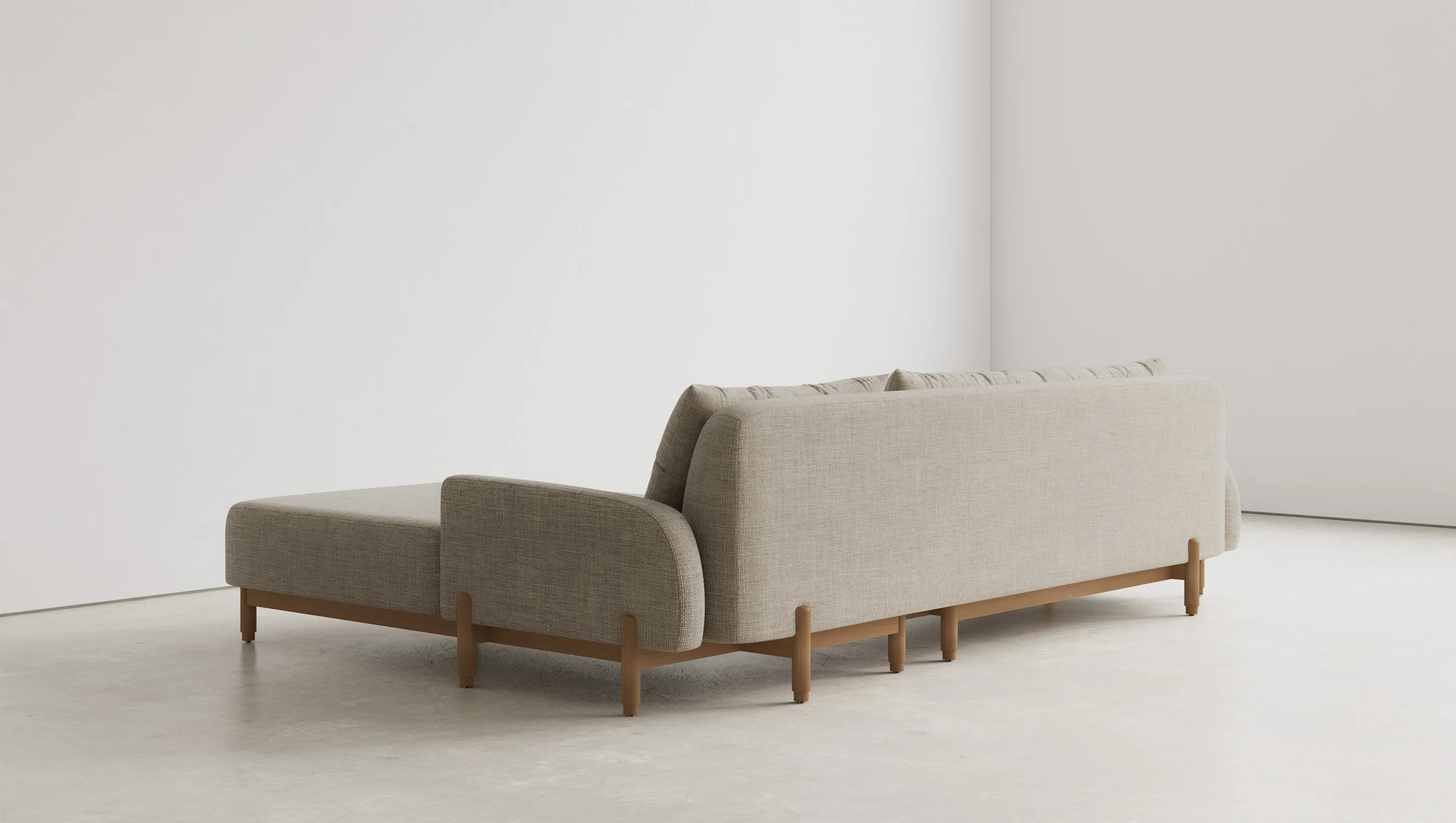 The Dune Chaise Sectional is inspired by the curvature of natural sand dunes, the sofa's arms, back and seat form a composition of intersecting shapes and planes. Equally elegant as it is comfortable. The sofa sits neatly in a solid wood base. Fabric is customer's own material.