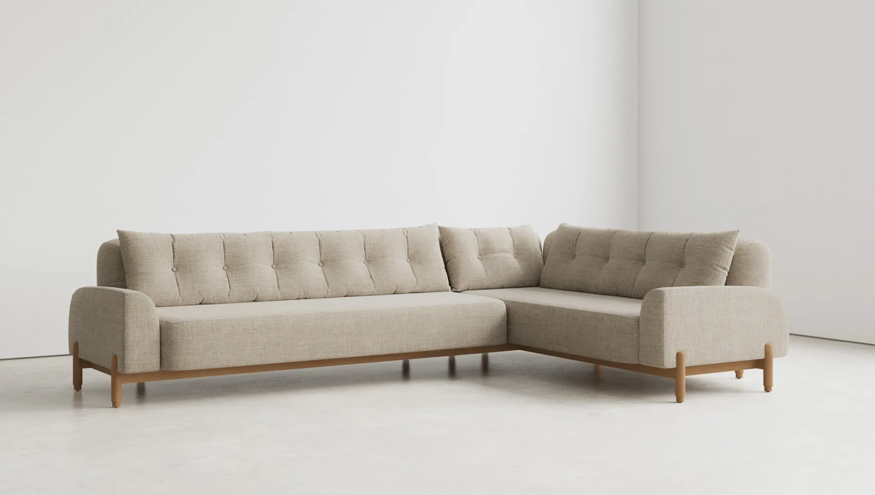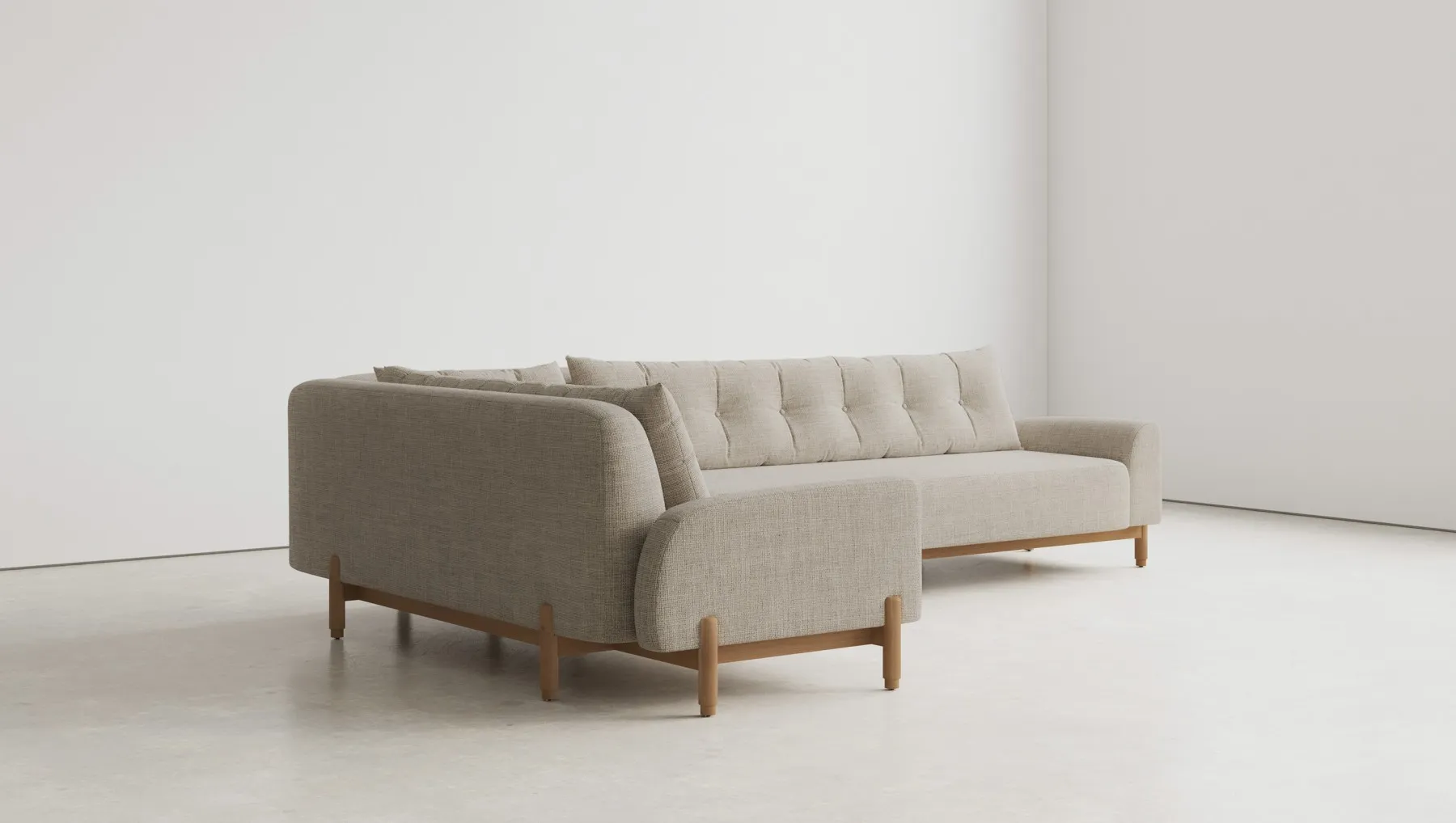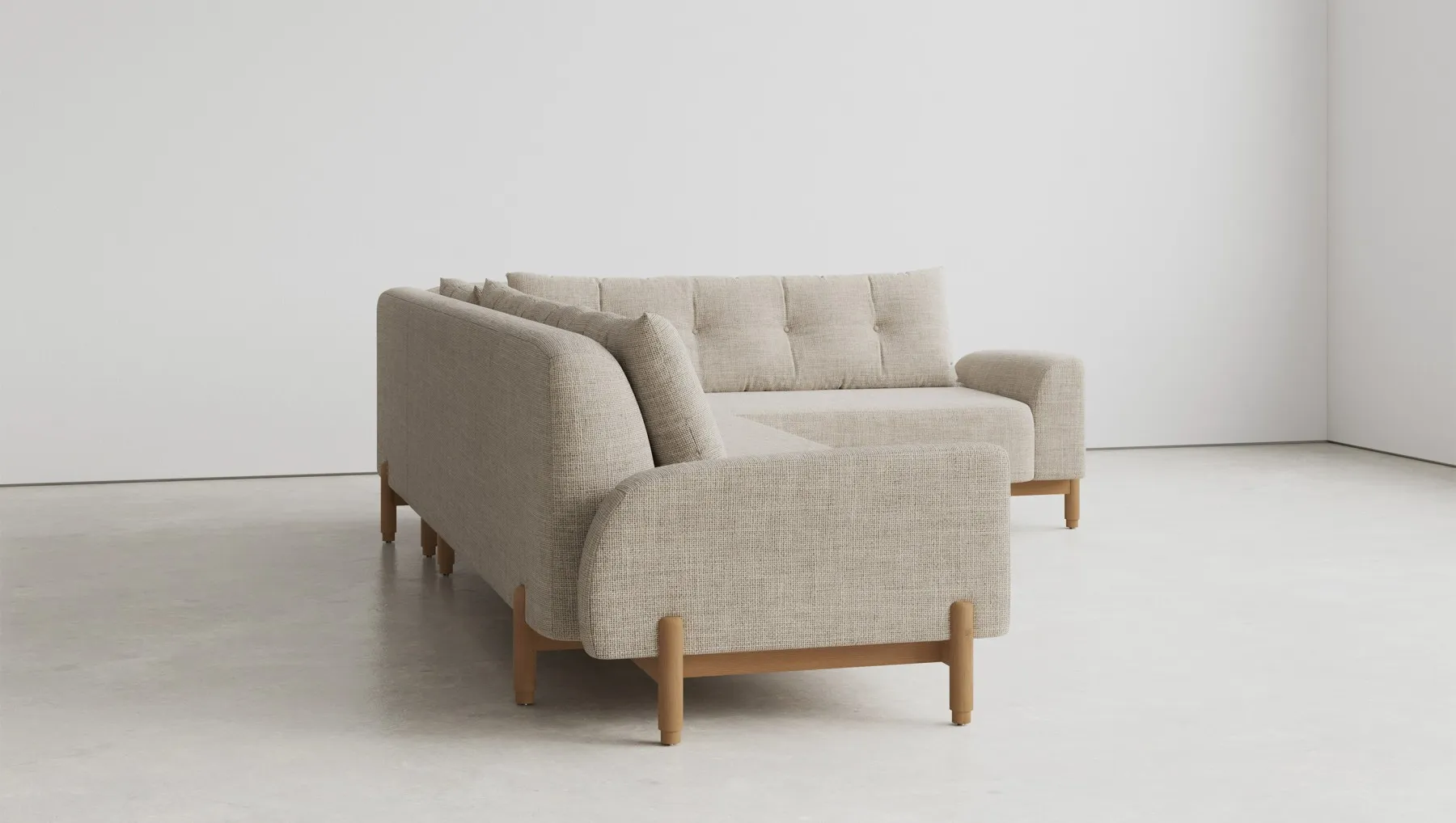 The Dune Corner Sectional is inspired by the curvature of natural sand dunes, the sofa's arms, back and seat form a composition of intersecting shapes and planes. Equally elegant as it is comfortable. The sofa sits neatly in a solid wood base. Fabric is customer's own material.