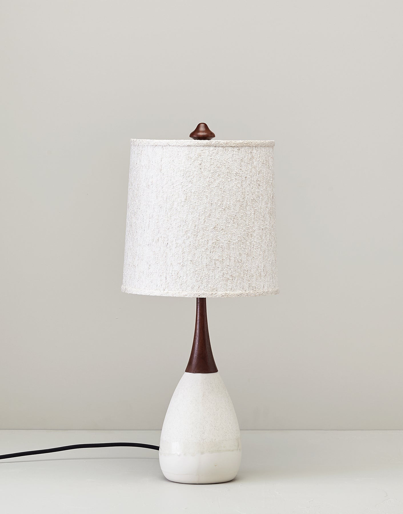 Classic mid-century styling, Esther has a hand poured porcelain base with hand turned walnut neck and finial. The shade is made from vintage 1950s boucle. All electrical components are UL listed. Maximum 60 watt light bulb.