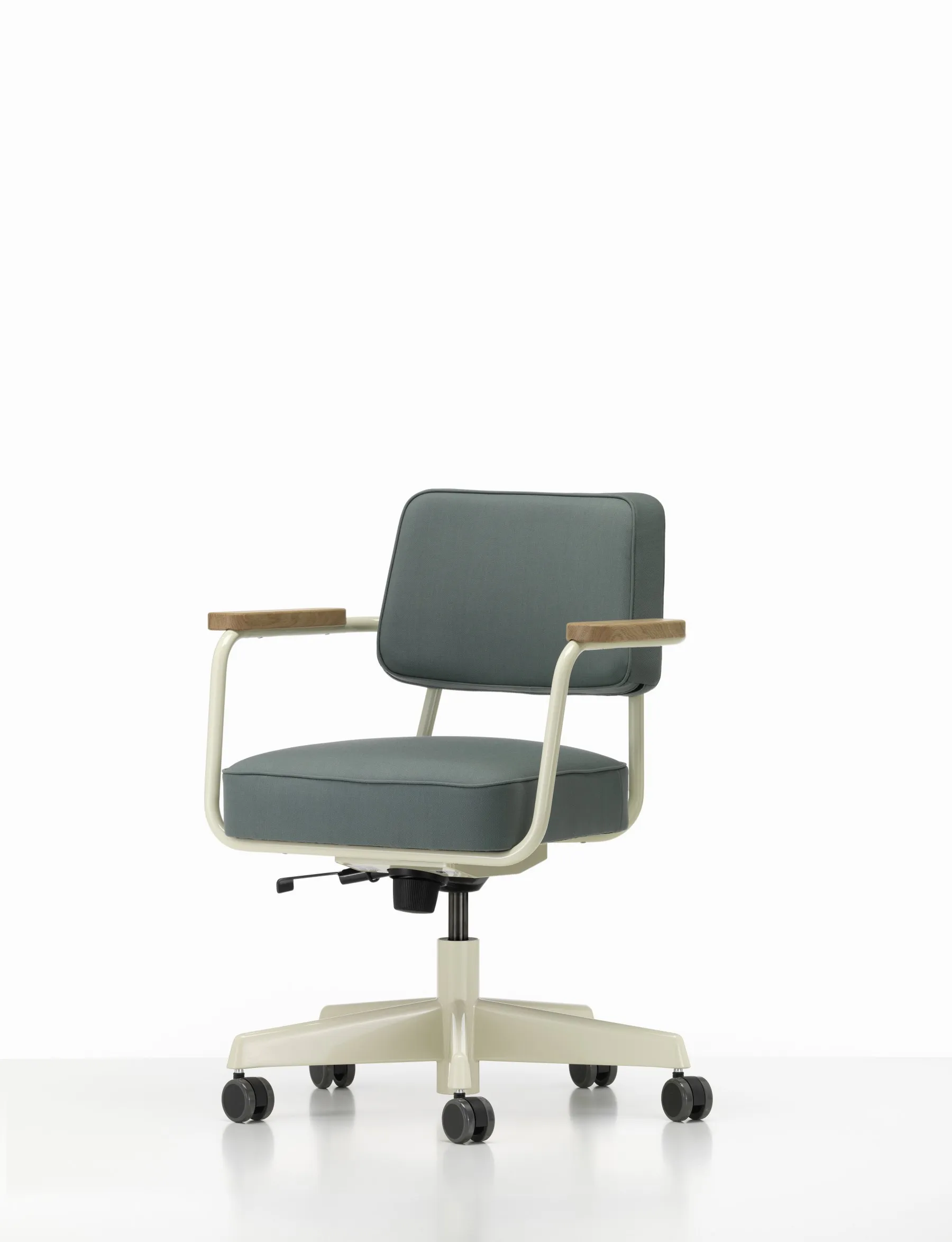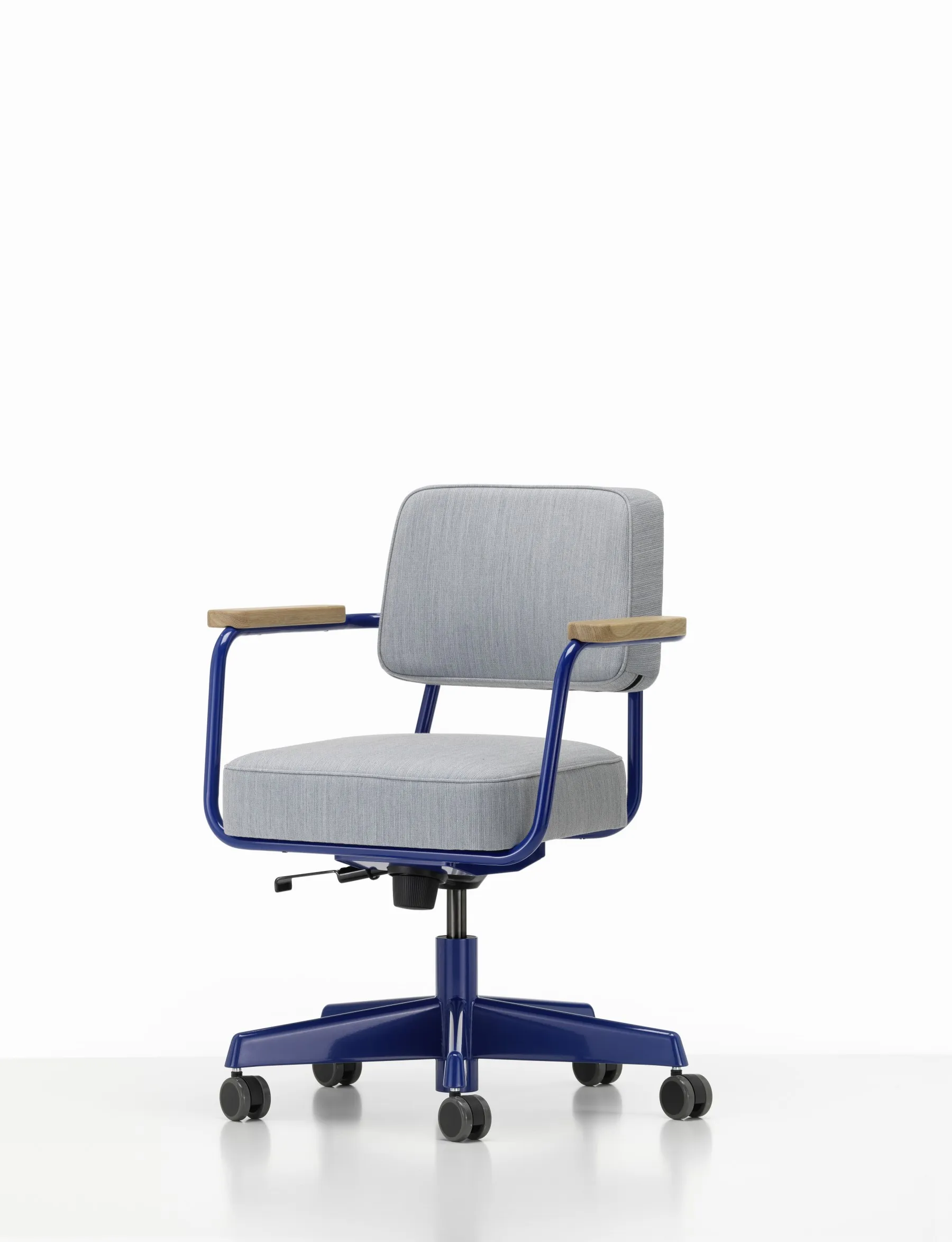 Base: five-star base made of bent sheet steel and tubular steel, powder-coated (smooth) in Blanc Colombe (Ecru) , Gris Vermeer, Blé Vert, Japanese Red, Bleu Marcoule, Bleu Dynastie or Deep Black. Equipped with double castors in basic dark, Ø 60 mm.