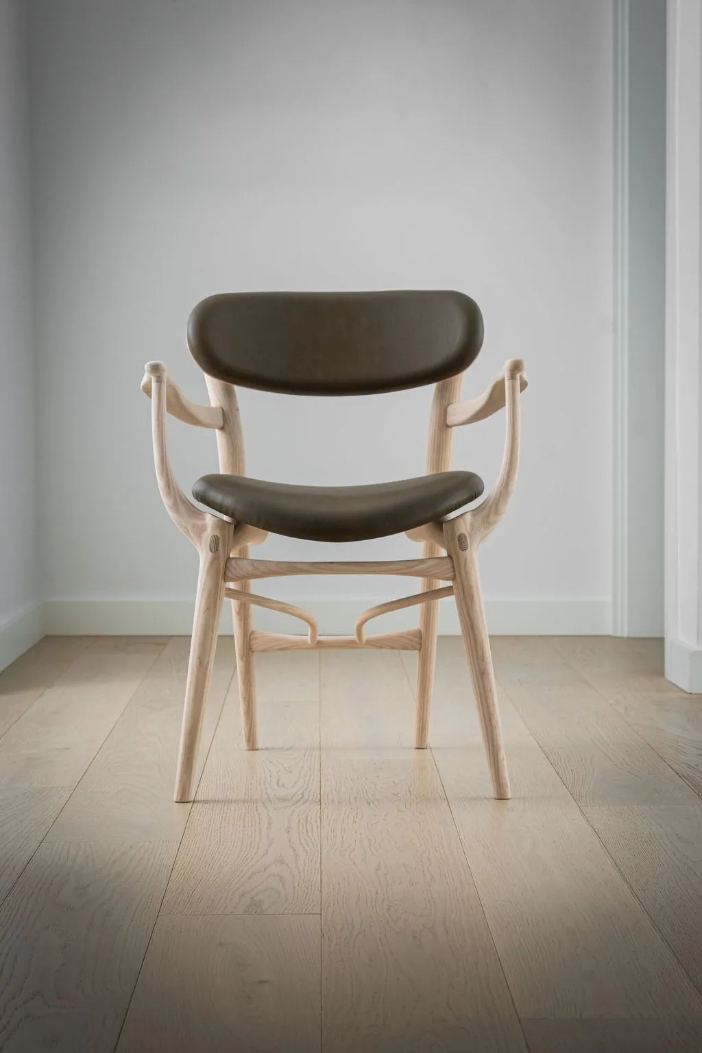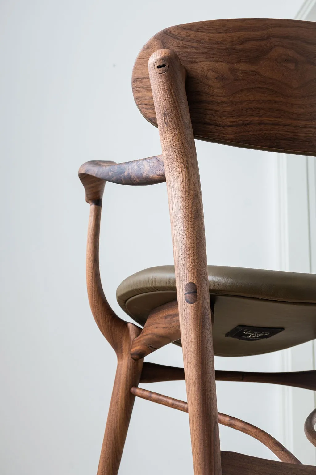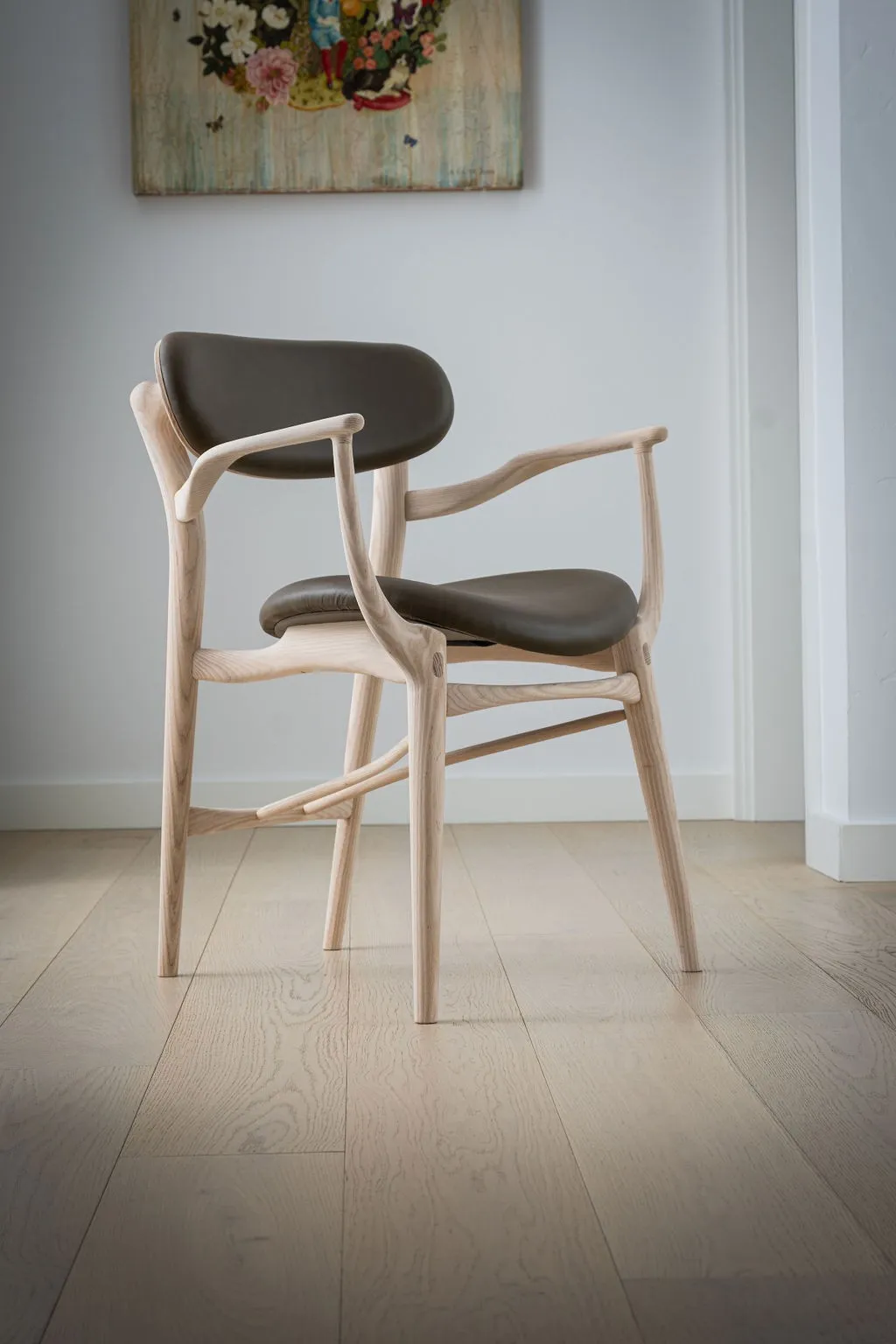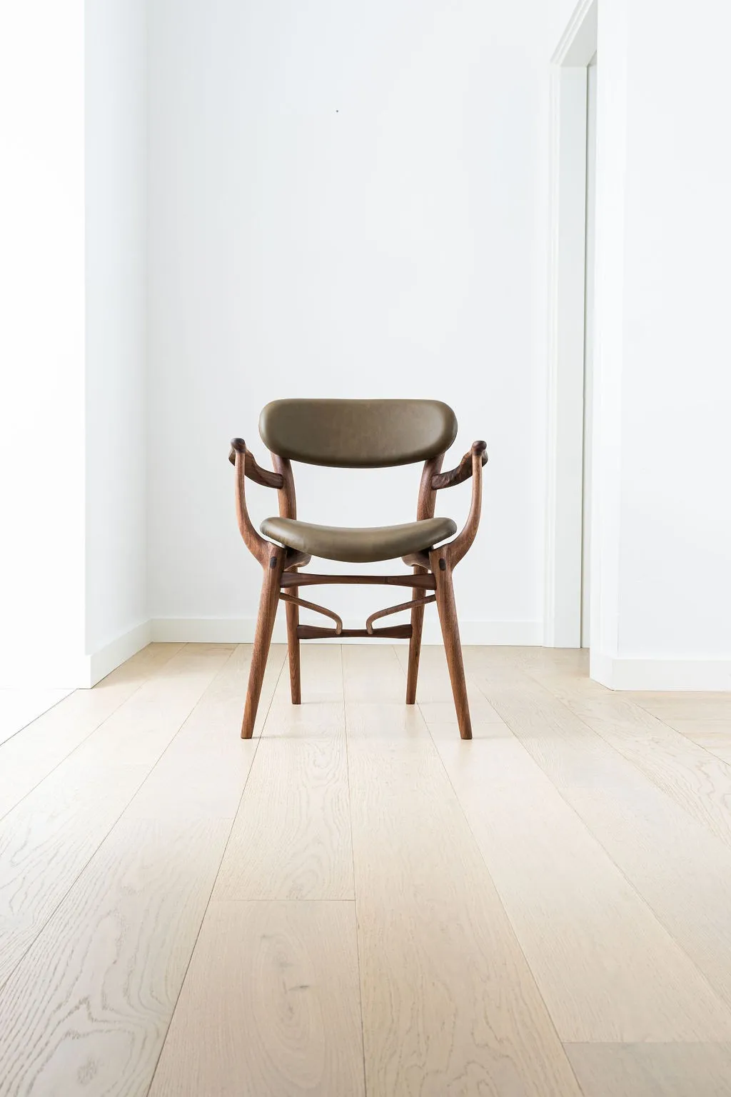 These musings led to what are now a few standout aspects of Fjoon: a vacuum-laminated upholstered seat with a sweeping compound curve stepped mortise-and-tenon joinery with a friction wedge and a patented wood plug system that allows for re-upholstery down the line without having to destroy / re-fabricate any chair parts. Select from ten upholstery leathers and textiles of the highest quality from Sorensøn and Kvadrat.