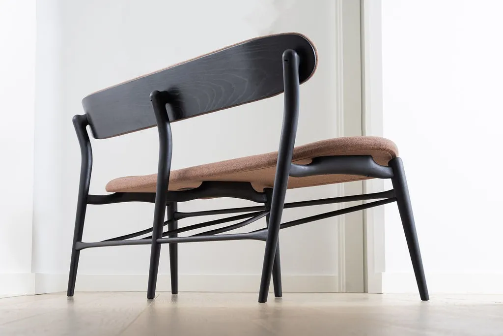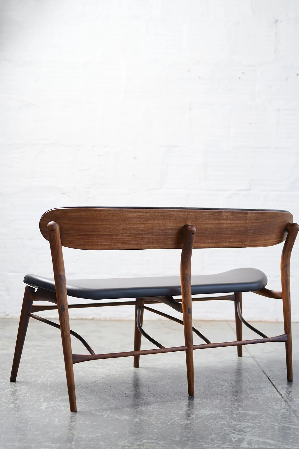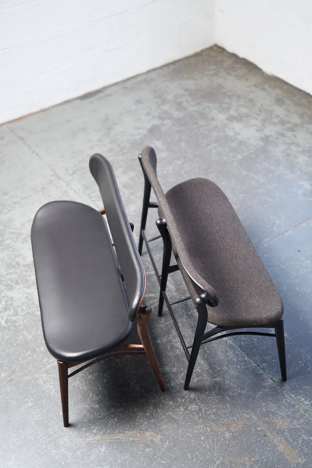 The fjoon settee features a vacuum-laminated upholstered seat with a sweeping compound curve, stepped mortise-and-tenon joinery with a friction wedge, and a patent-pending wood plug system which allows for re-upholstery down the line without having to destroy / re-fabricate any chair parts.