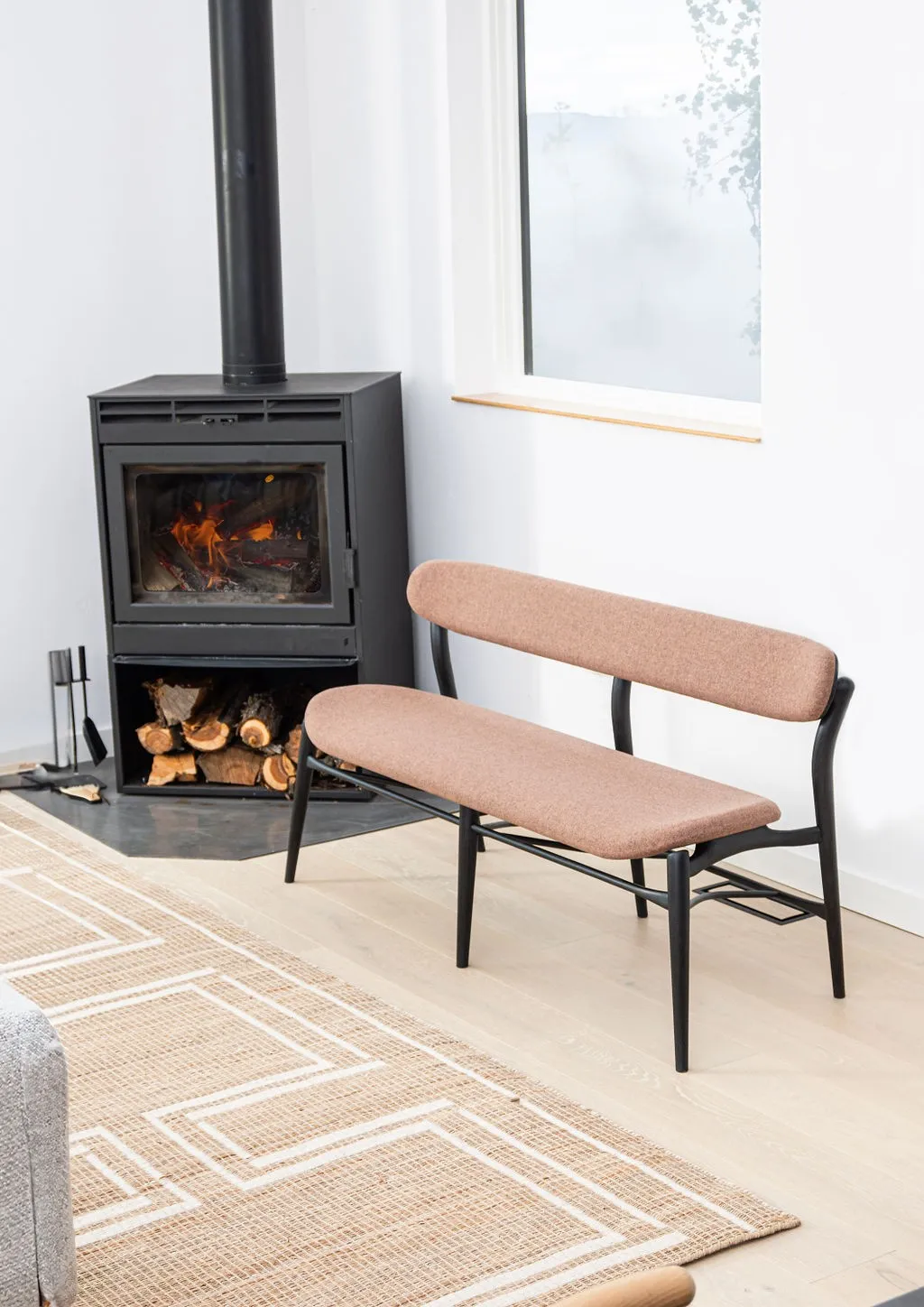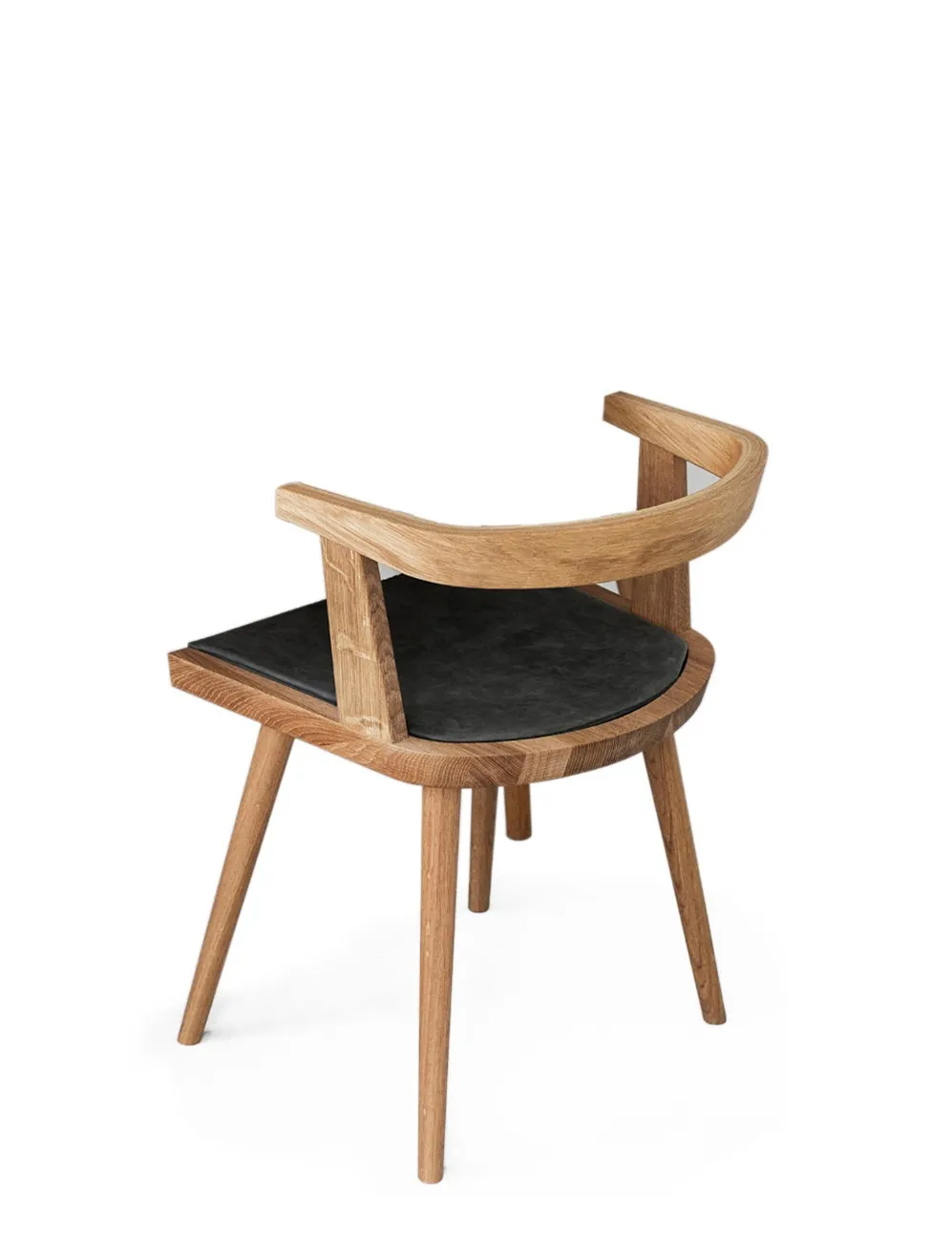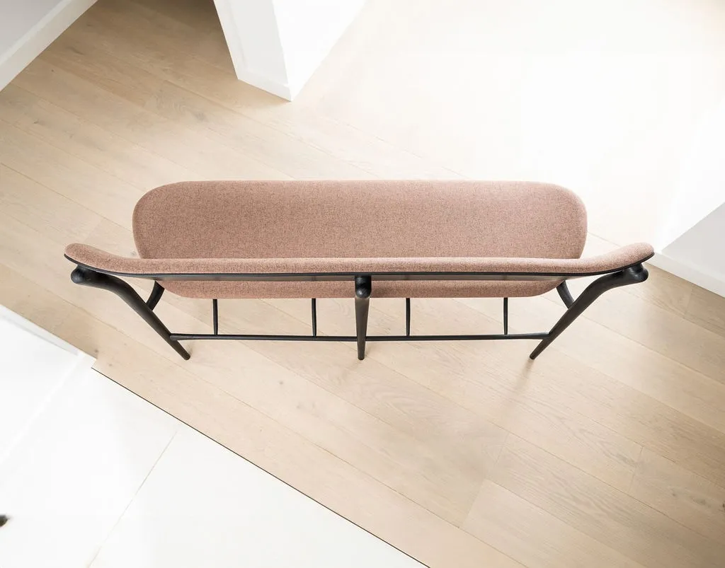 The fjoon settee features a vacuum-laminated upholstered seat with a sweeping compound curve, stepped mortise-and-tenon joinery with a friction wedge, and a patent-pending wood plug system which allows for re-upholstery down the line without having to destroy / re-fabricate any chair parts.
