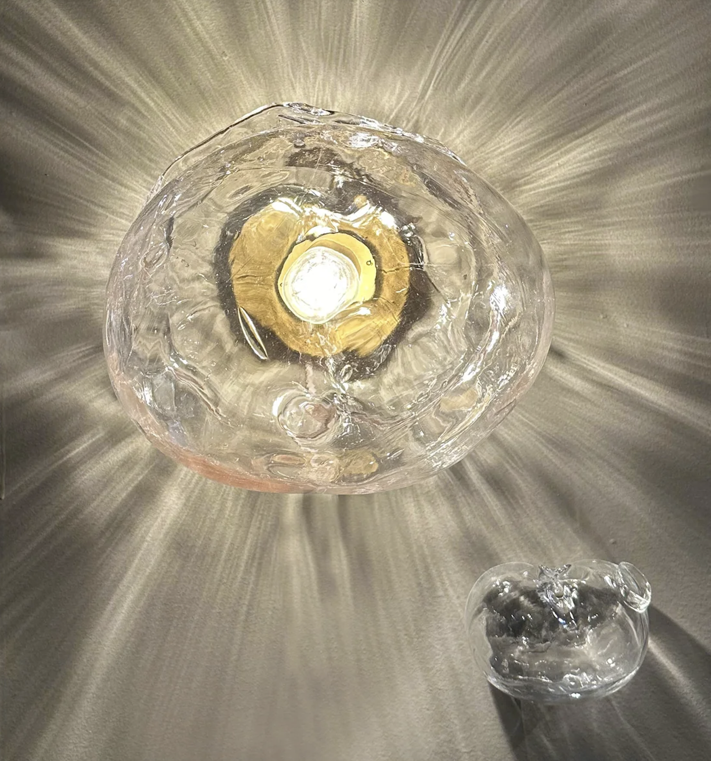 Beams of light radiate through this organic and spontaneously shaped orb and are cast onto the wall following the pattern and texture of the hand-made blown glass. They are reminiscent of how water, stone, and ice formations occur in nature.