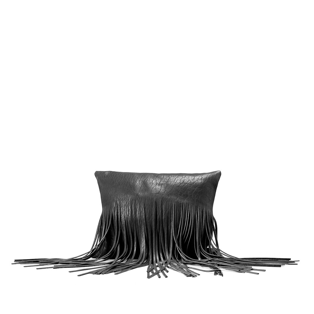 Add flair to your furniture. The sexy and supple pillow has a smooth top that gracefully transforms into long hanging leather fringe adornment.