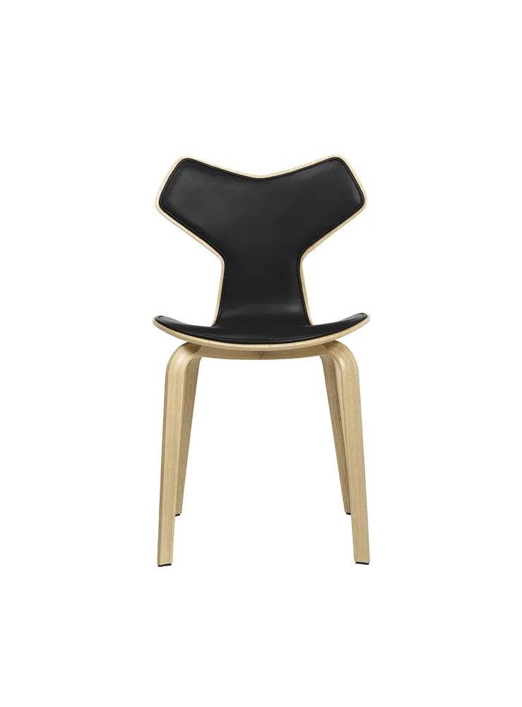 Wooden legs are angled smoothly outwards in this design, mimicking the steel legs of Jacobsen’s other plywood chairs. This is one of the few Arne Jacobsen chair designs with wooden legs. Remember that the Grand Prix chair with wooden legs is not stackable.