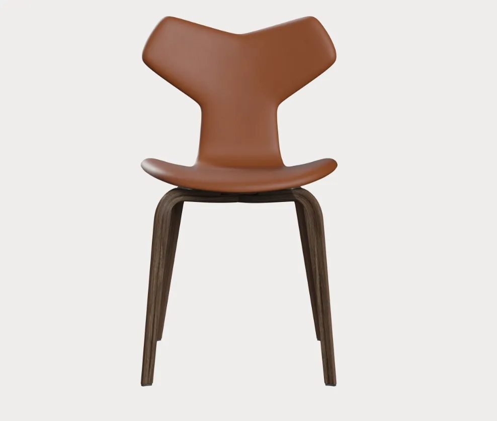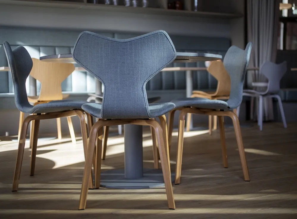 Wooden legs are angled smoothly outwards in this design, mimicking the steel legs of Jacobsen’s other plywood chairs. This is one of the few Arne Jacobsen chair designs with wooden legs. Remember that the Grand Prix chair with wooden legs is not stackable.