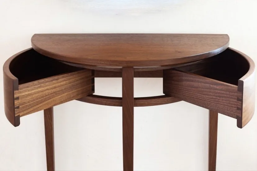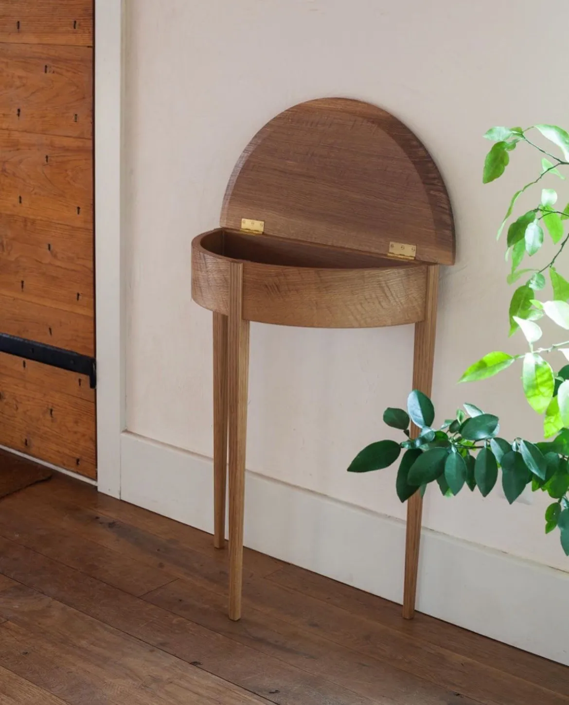 Based on a traditional demi-lune table. Features a hinged top with storage within. Also available with drawers