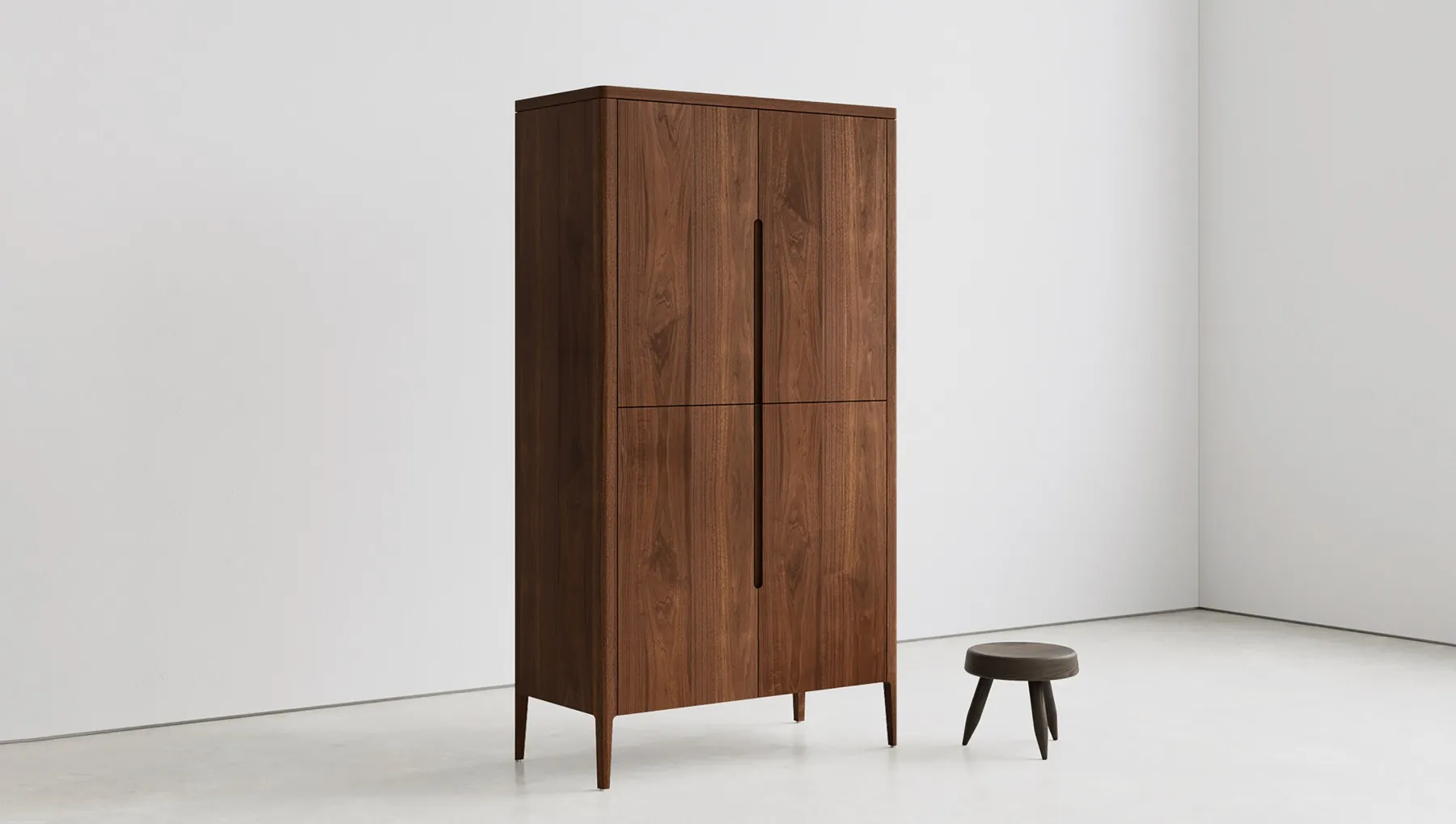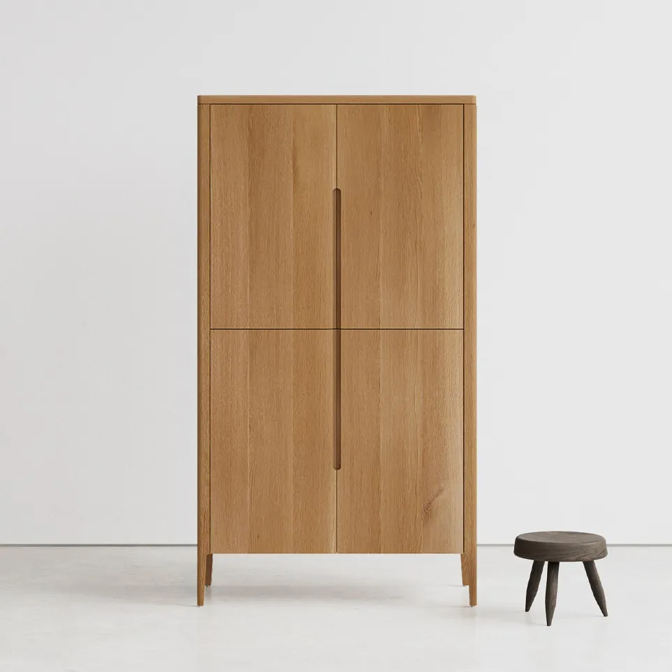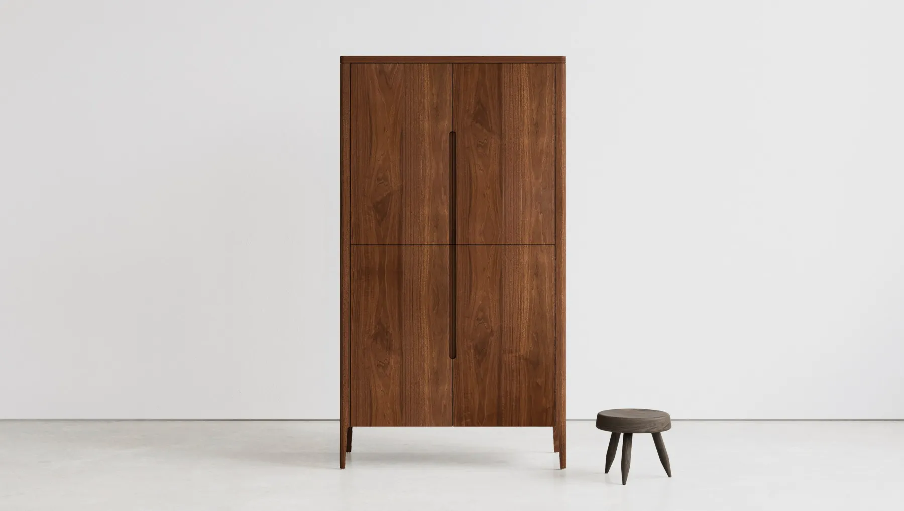 The Harvest Hutch is designed to house glassware, spirits, and accouterment. The front features hand-sawn veneered doors with integrated pulls.