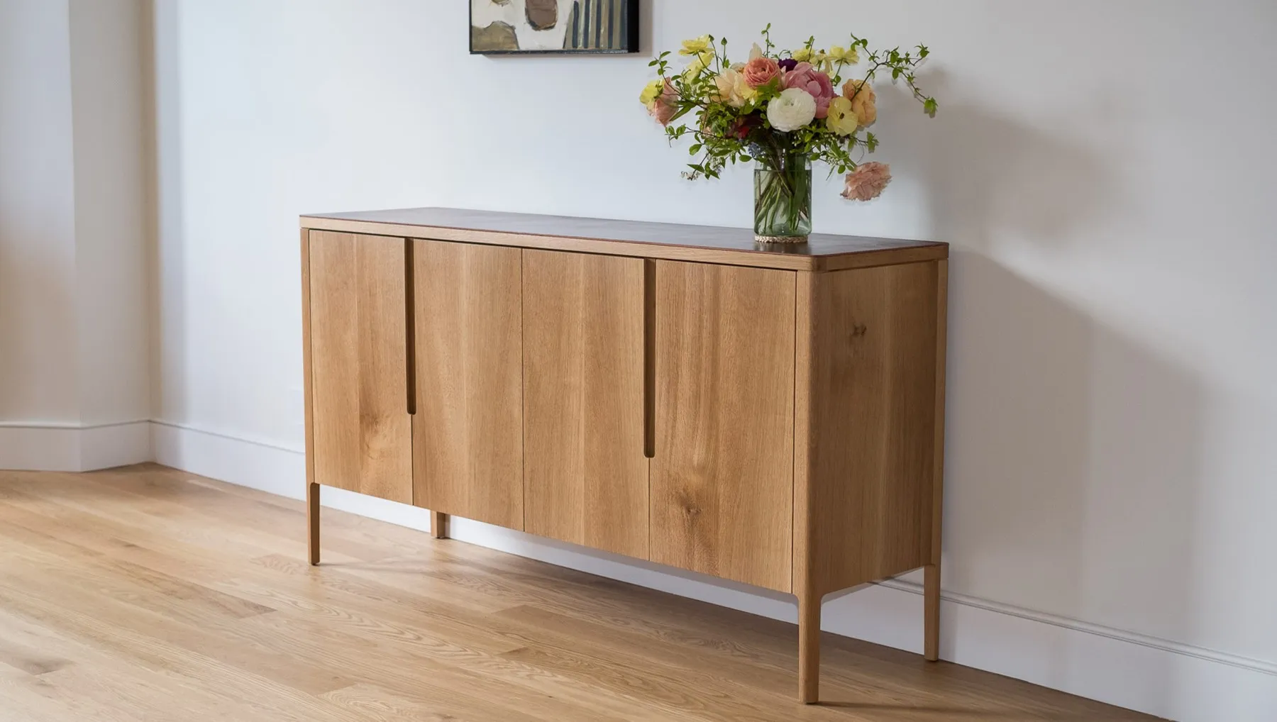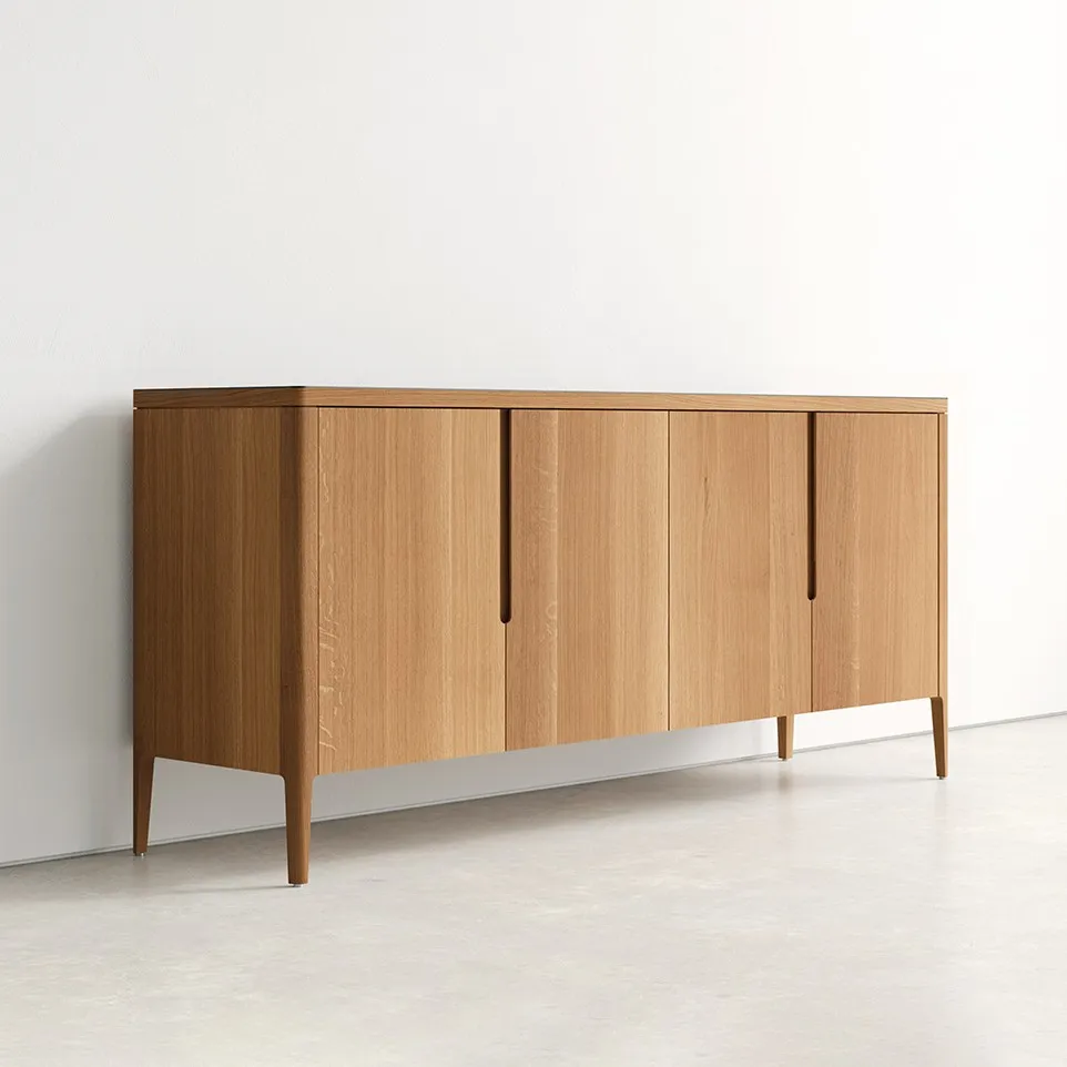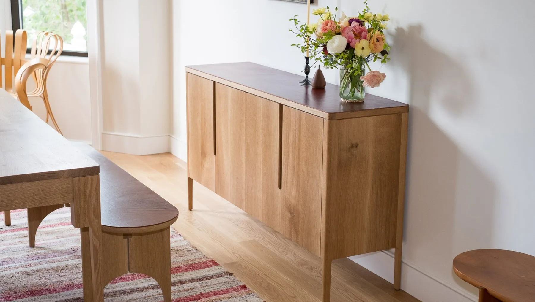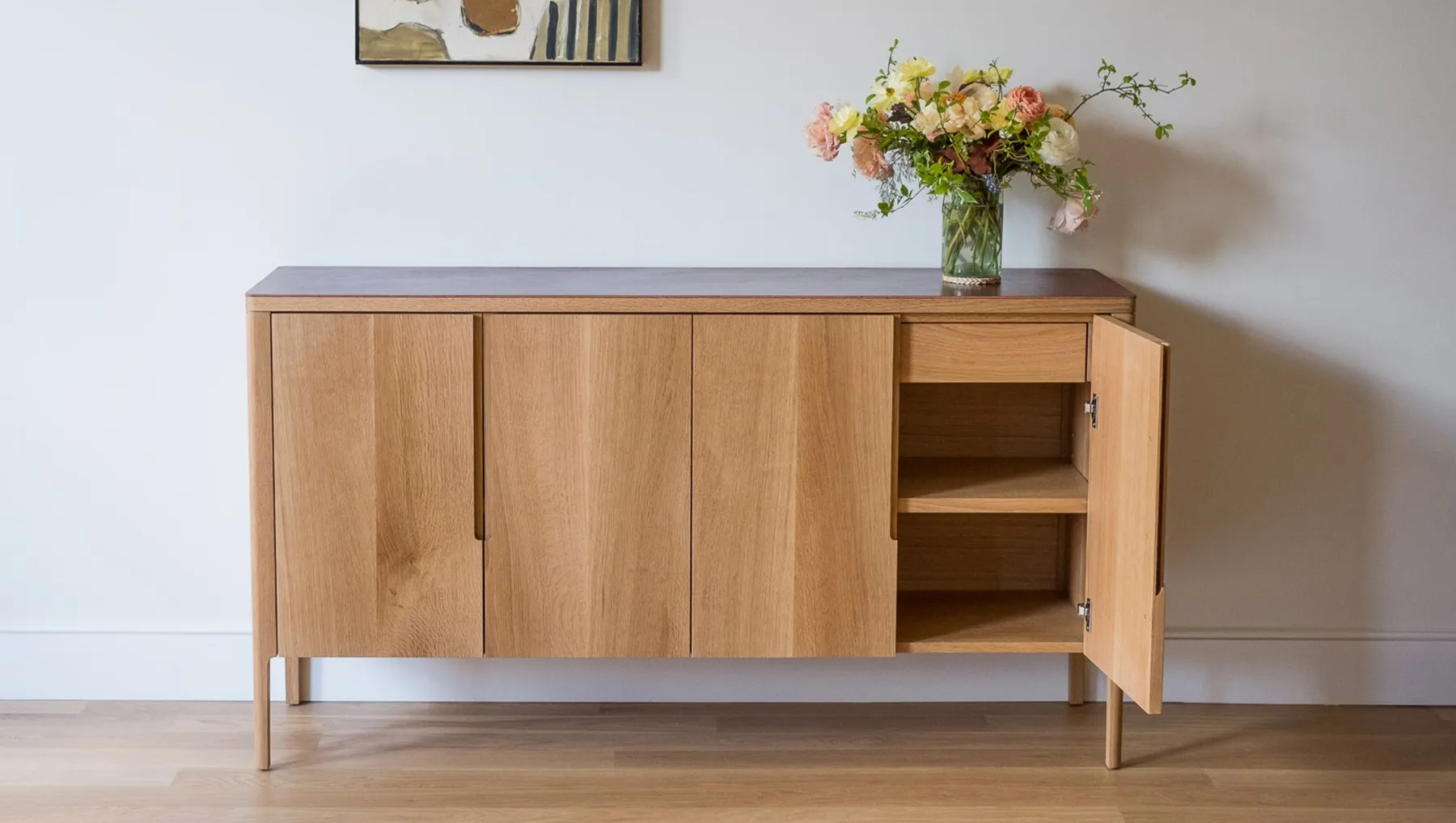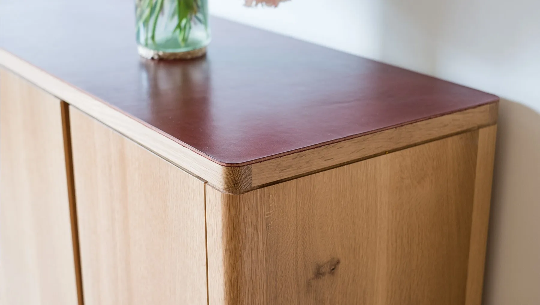 The Harvest Sideboard is designed to house glassware, spirits, and accouterment. The front features hand-sawn veneered doors with integrated pulls. The top is clad in hand finished, full grain leather - a material chosen for its natural beauty and texture.