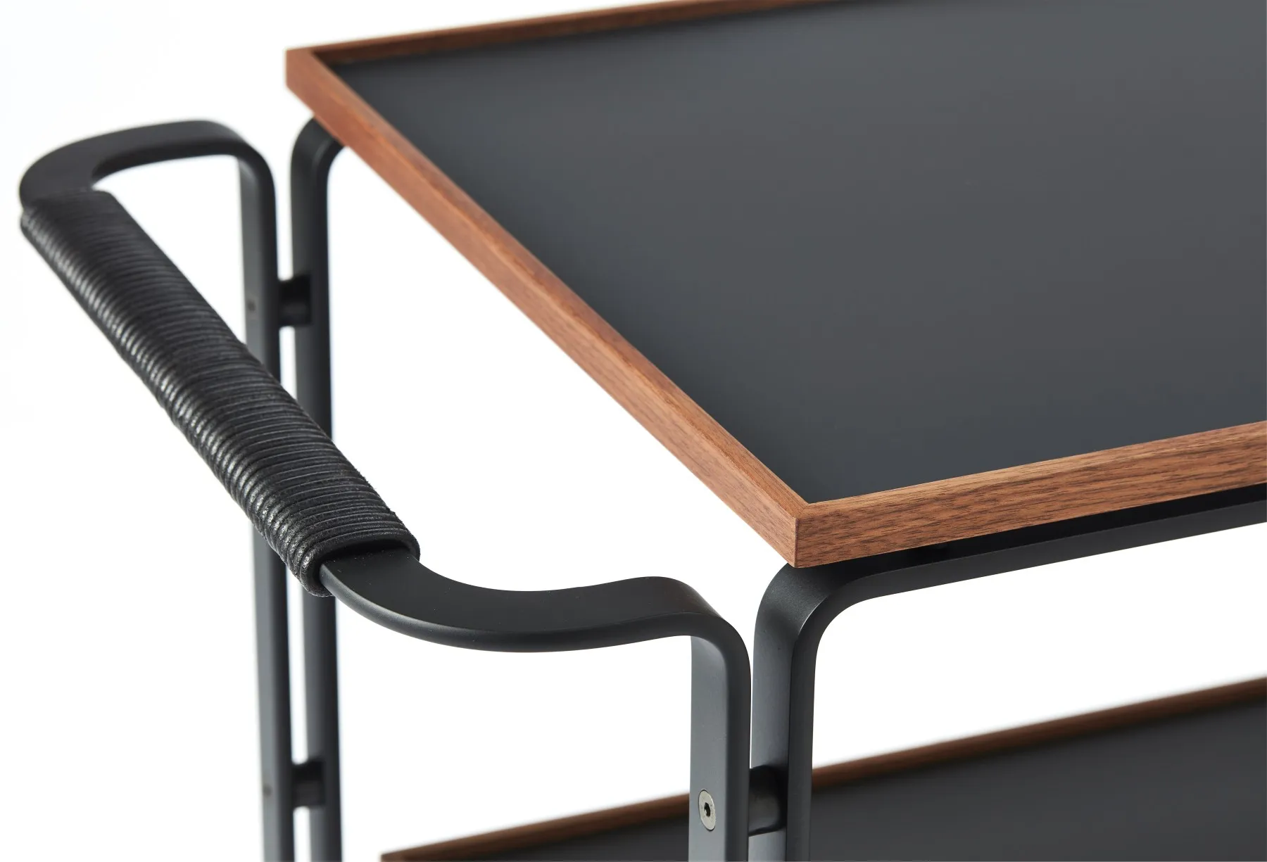 Frame in black powder coated steel, black tray with Walnut edges and handgrip in black leather.