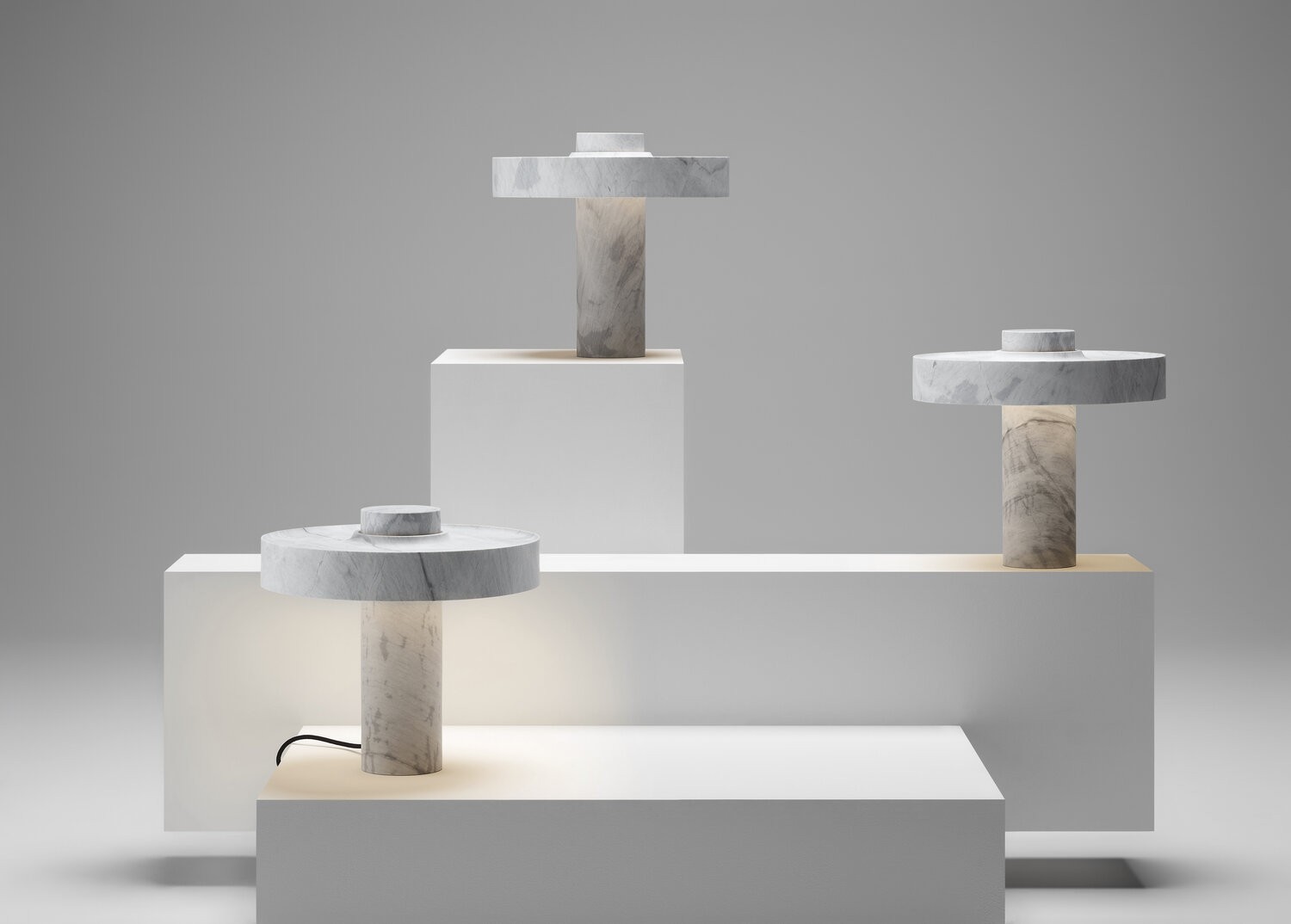 The Hemera Lamp in crafted from Elba, a beautiful natural marble that is hard-wearing, long-lasting and naturally resilient. The internal cage of the Hemera Desk Lamp is finished to anodised champagne.