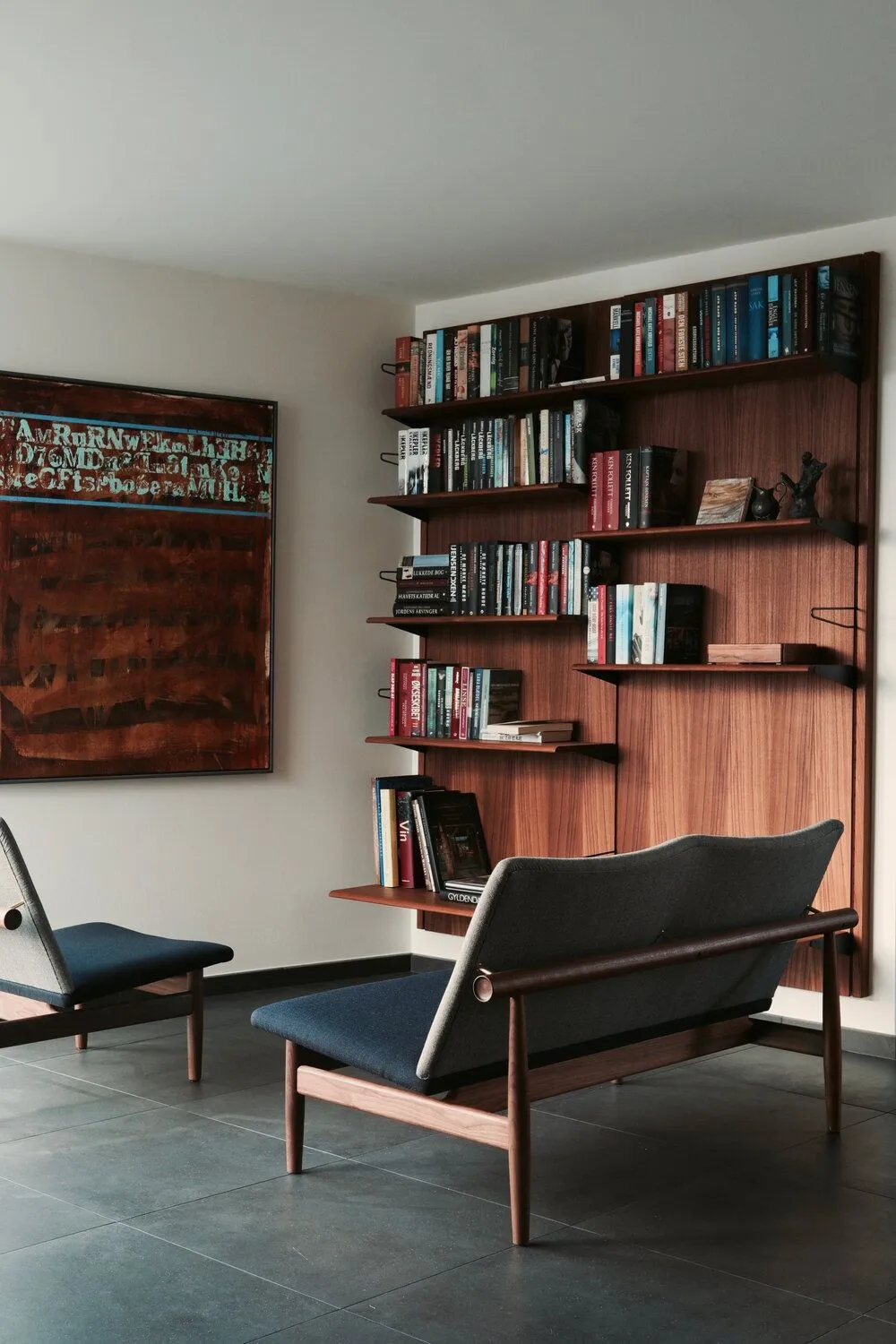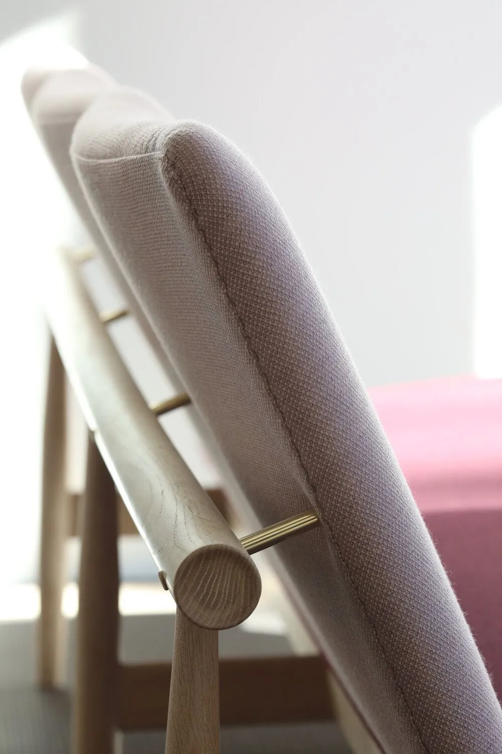 Even with the Japan Sofa's simple construction, Finn Juhl was true to his idea of emphasizing the difference between the carried and the carrying elements by separating the backrest from the bearing frame with brackets in brass.