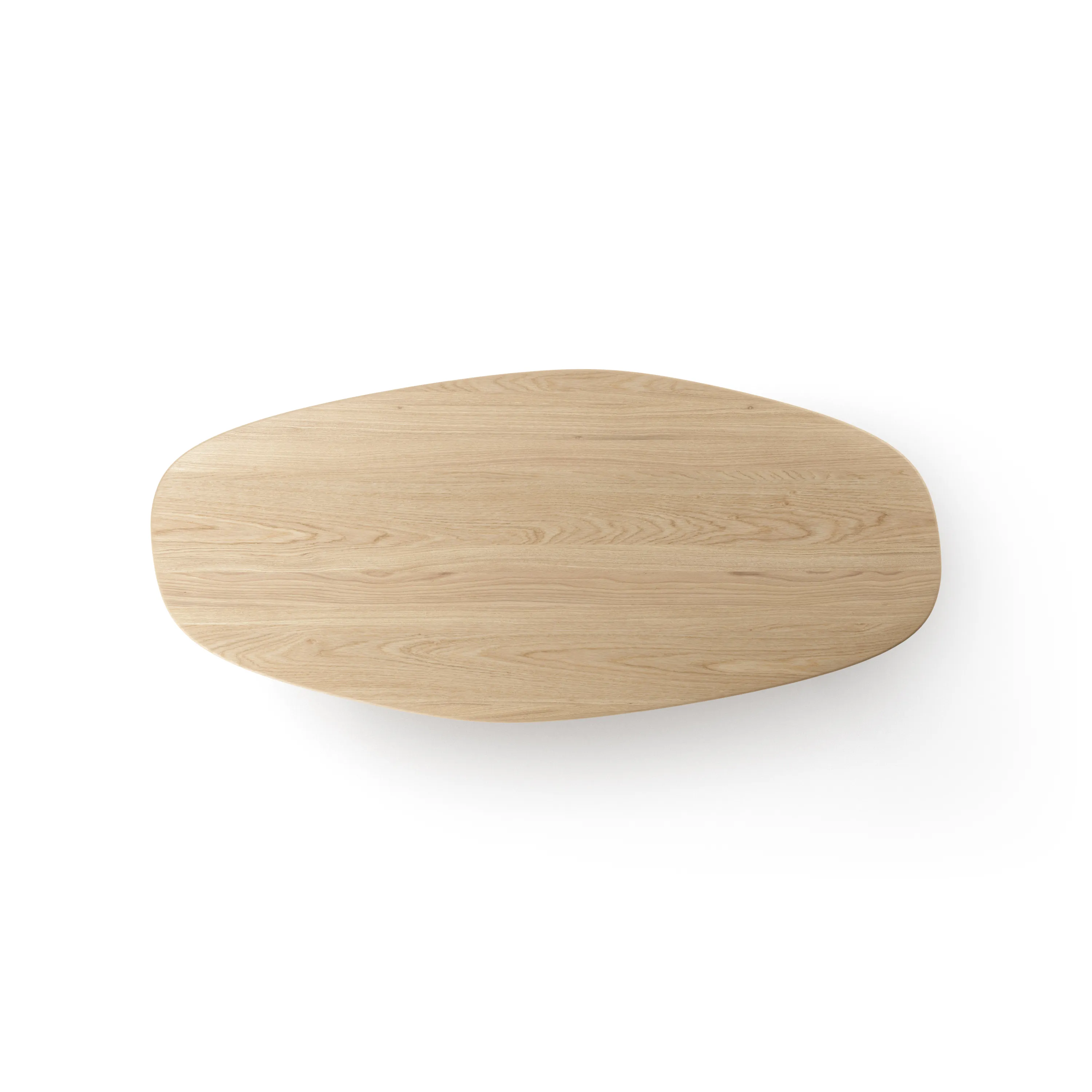 The tables are shaped as organic circles or ellipses with rounded soft edges for a smooth touch. The legs have narrowing profiles for a floating appearance.